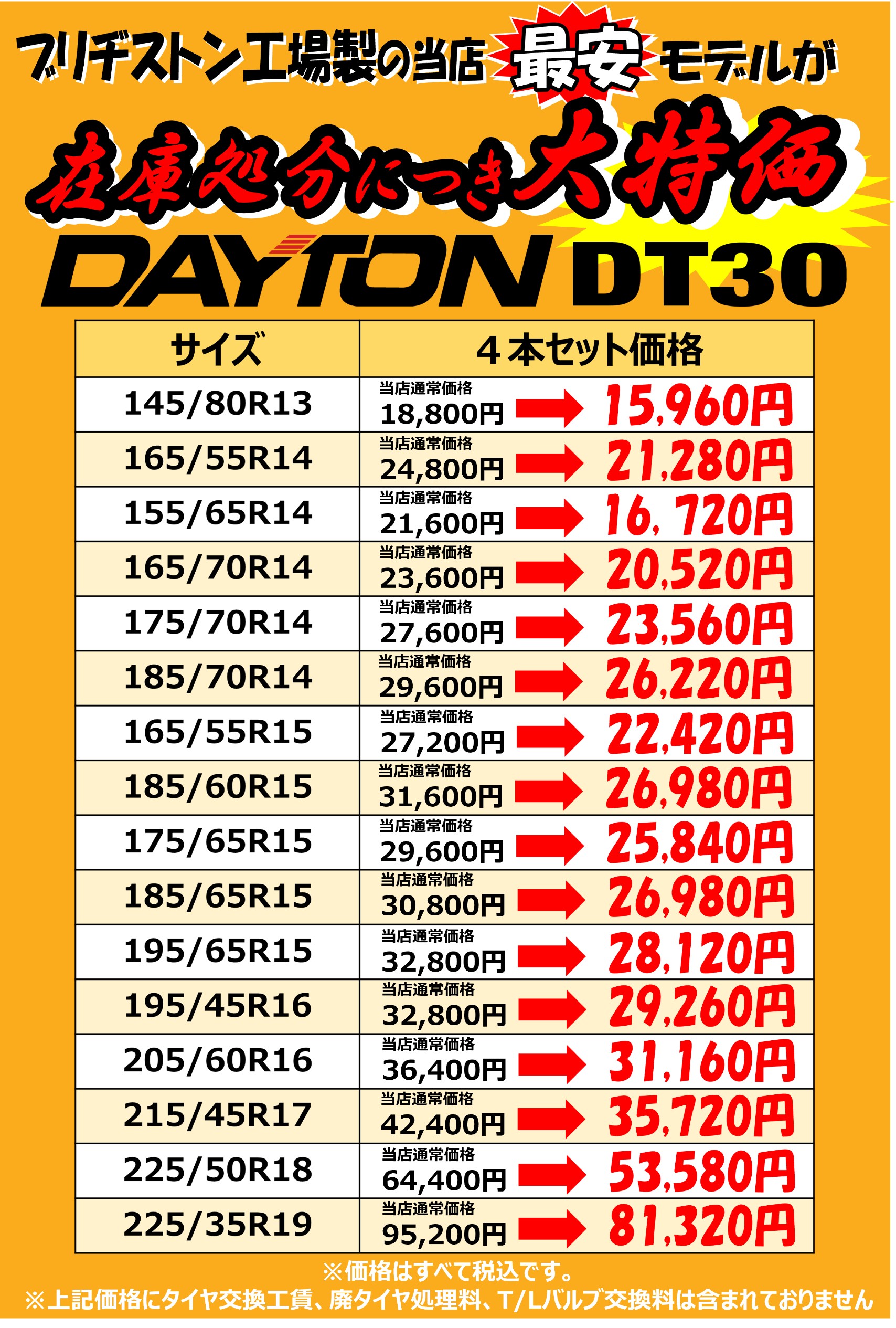 お手頃タイヤ【デイトンDT30】が在庫限りの処分特価販売中!!お見逃しなく~★ ポスト 2025年3月7日 最初で最後のデイトンDT30特価セール!! 4本(タイヤのみ)で上記の価格で販売いたします!! 18インチや19インチのインチアップサイズもあります☆ ※サイズによっては販売終了している場合もございます。 詳しくは最寄りのタイヤ館各店舗へお問い合わせください。 在庫限りとなりますのでタイヤ館東大阪へご来店ください!! (デイトンは一部サイズは未入荷ですが予約可能です) 善は急げ!!! タイヤ館 東大阪 住所:579-8005大阪府東大阪市元町2丁目2-50 電話番号: 072-980-1300 相談予約 カテゴリ:タイヤ関連 その他商品・サービス 商品情報