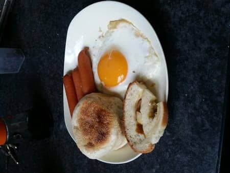 お昼ご飯はパンにあわせてかるーく目玉焼きとウィンナーを添えてみたり(いかしてるでしょ)