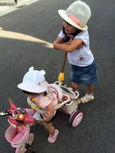 小学校から帰ったお姉ちゃんと、下の子と一緒に家の前で