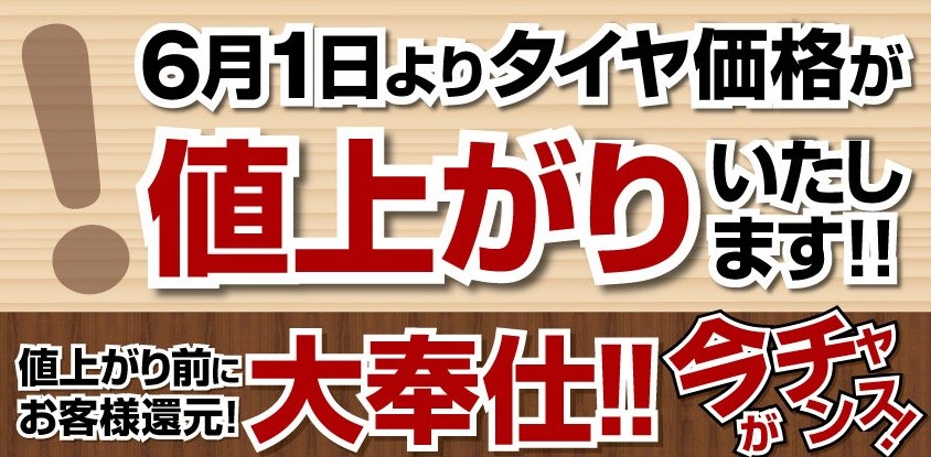 急ですが、6/1よりタイヤが値上がり致します!