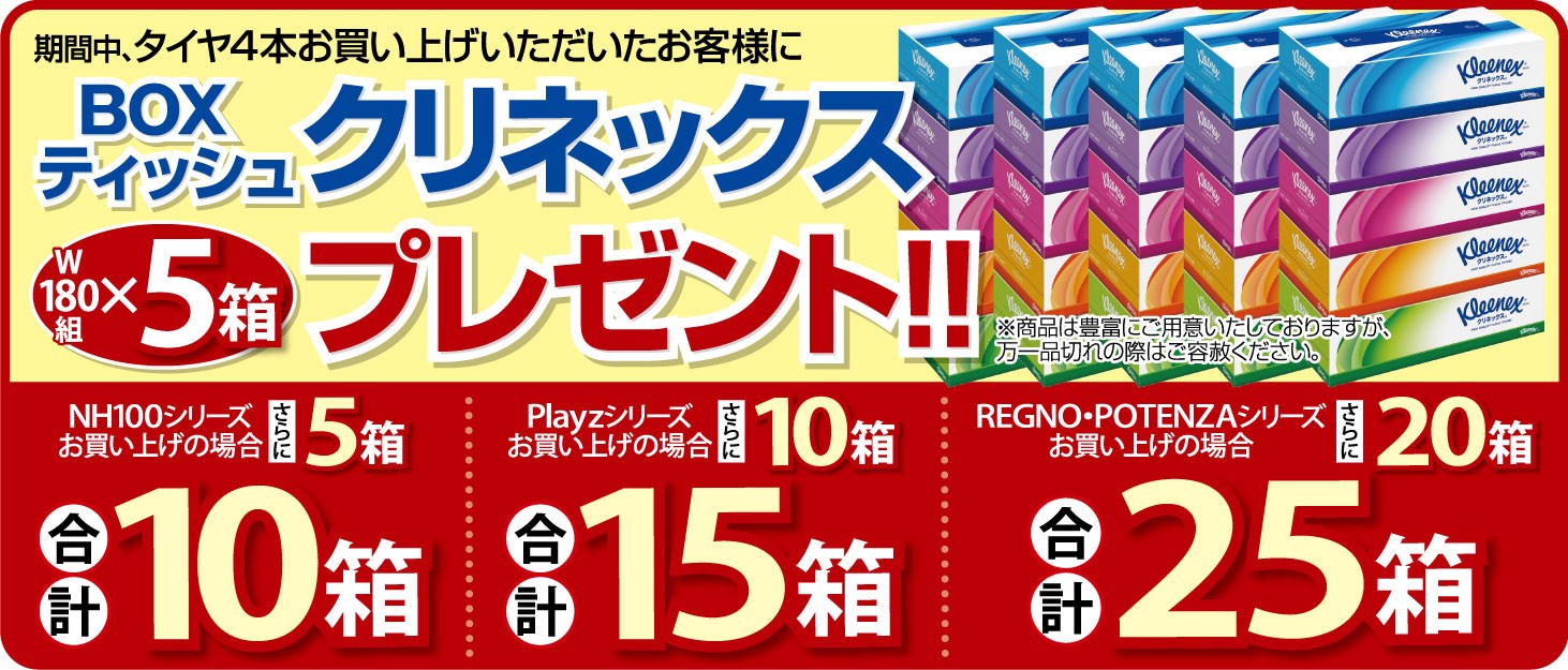 タイヤ祭り期間中にタイヤ4本お買い上げのお客様にティッシュを5箱プレゼント!