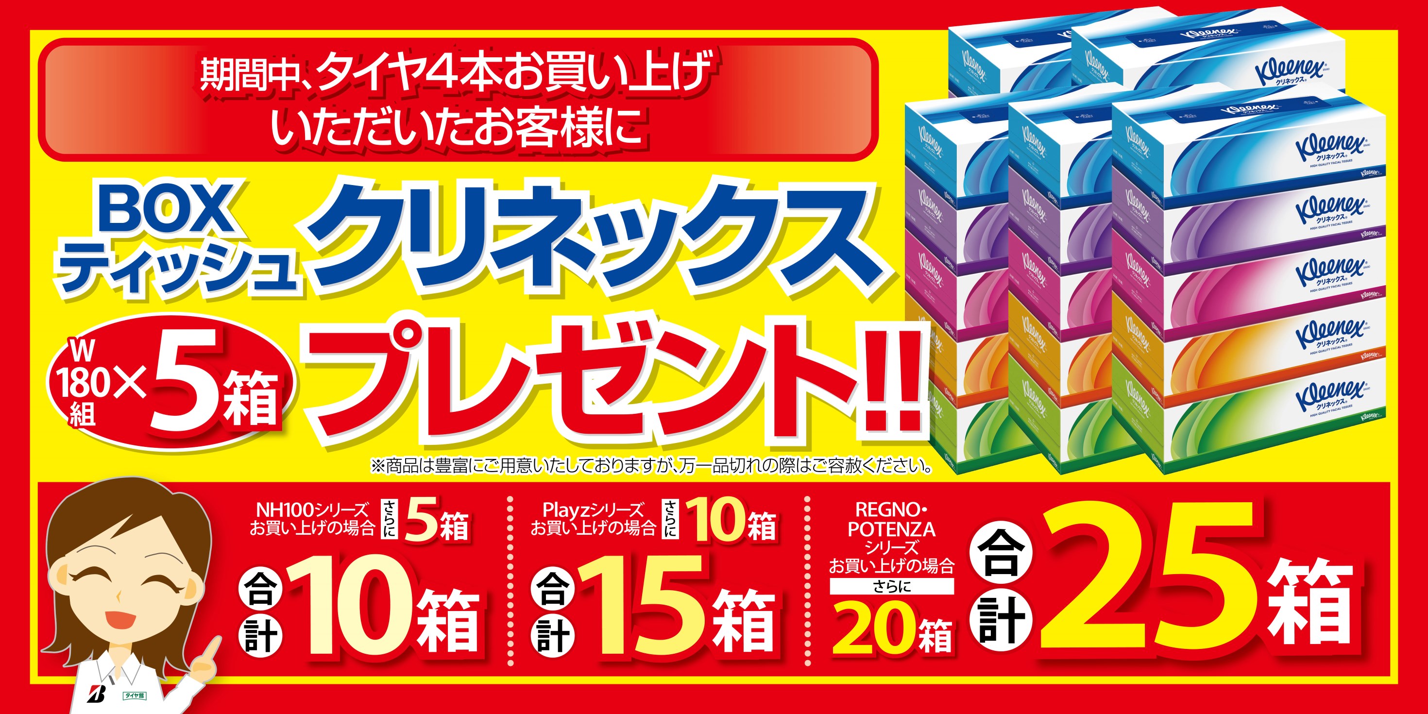 期間中はタイヤ4本お買い上げのお客様にティッシュを5箱プレゼント!