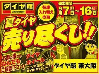 残り3日【売りつくしセール】お急ぎ下さい!! ポスト 2013年9月13日 売りつくしセールも残り3日となりました。まだまだ沢山のご来店お待ちしております☆お買得タイヤやホイールセット、カーメンテナンス商品まで!!何でもご相談下さいね♪この3連休は是非、タイヤ館東大阪店までご来店下さいね♪ 担当:寺ちゃん