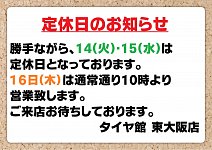 タイヤ館東大阪店のホームページをご覧頂きありがとうございます 勝手ながら、8月14日(火)と8月15日(水)はお休みとなっております ご迷惑をお掛けしますが、よろしくお願い申し上げます なお、当店の営業時間は10時から19時となっております(^^) 木曜日以降の御来店、心よりお待ちしております。