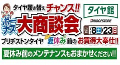 7月8日より開催しておりました、ボーナス大商談会は 23日をもちまして終了致しました。 セール期間中は多数様にご来店、ご成約頂き 誠にありがとうございました!! いつもご利用いただいてるお客様も、今回初めてタイヤ館にご来店されたお客様も また、空気圧のチェックだけでもお気軽にお立ち...