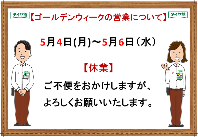 いつもタイヤ館東大阪のWEBをご覧いただきありがとうございます☆ 【ゴールデンウィークの営業について】 5月4日(月) 5月5日(火) 5月6日(水) 上記の3日間が【ゴールデンウィーク休業】となっております。 ※5月1日(金)・5月2日(土)・5月3日(日)は通常に営業しております。 5月7日...
