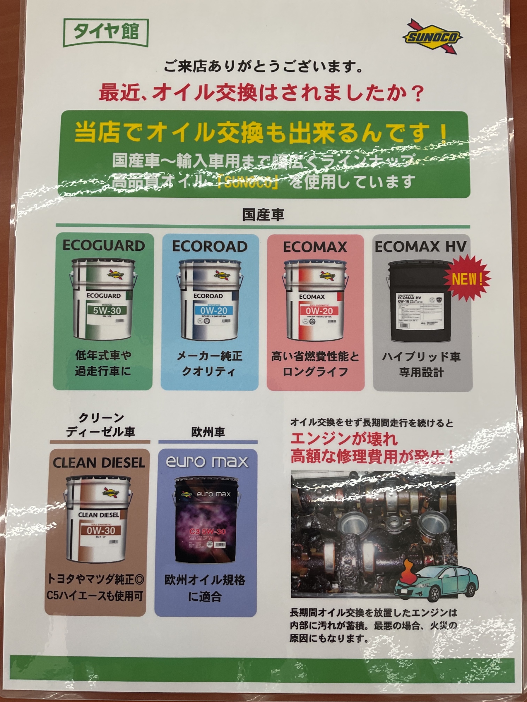 連休前のエンジンオイル交換はいかがですか。 ポスト 2025年8月8日 みなさんこんにちは^ ^ 連休のお出かけ前のエンジンオイル交換は大丈夫ですか? エンジンオイルはエンジンにとって大事なオイルで、人間で言うと血液と同じくらい 大事な物になります! なので定期的な交換が必要です。 タイヤ館光では各種エンジンオイルを取りそろえています^ ^ みなさんのご来店お待ちしております^ ^ オイル交換と一緒に無料安全点検もいかがですか?