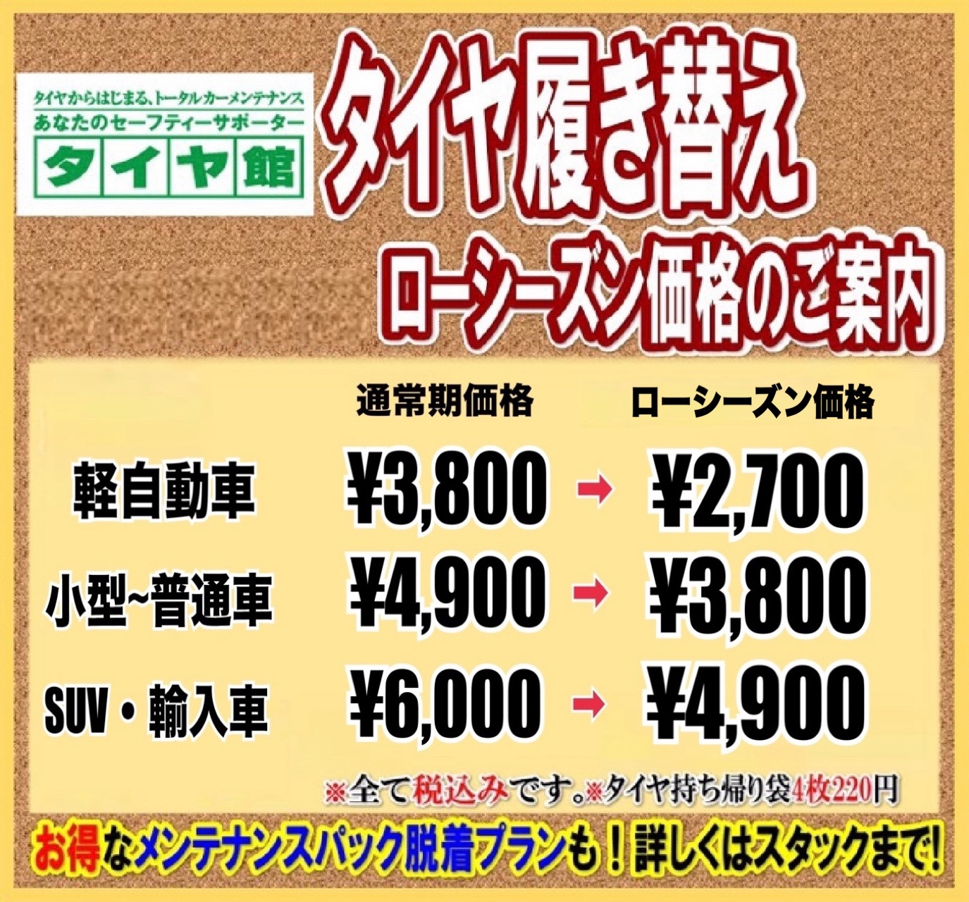 タイヤ館彦根では3月1日から3月31日までの間、履き替えをローシーズン価格でできます!