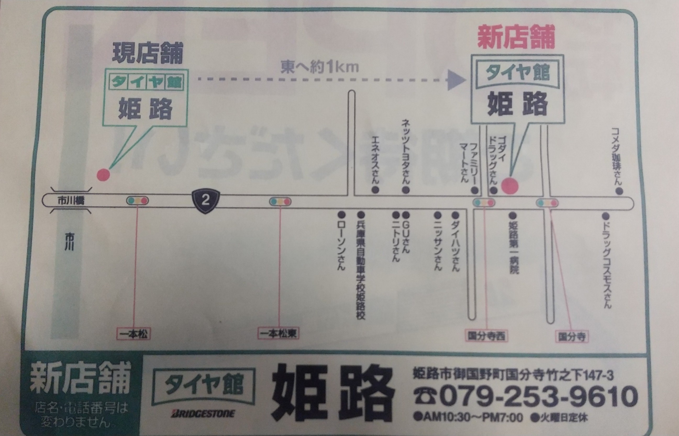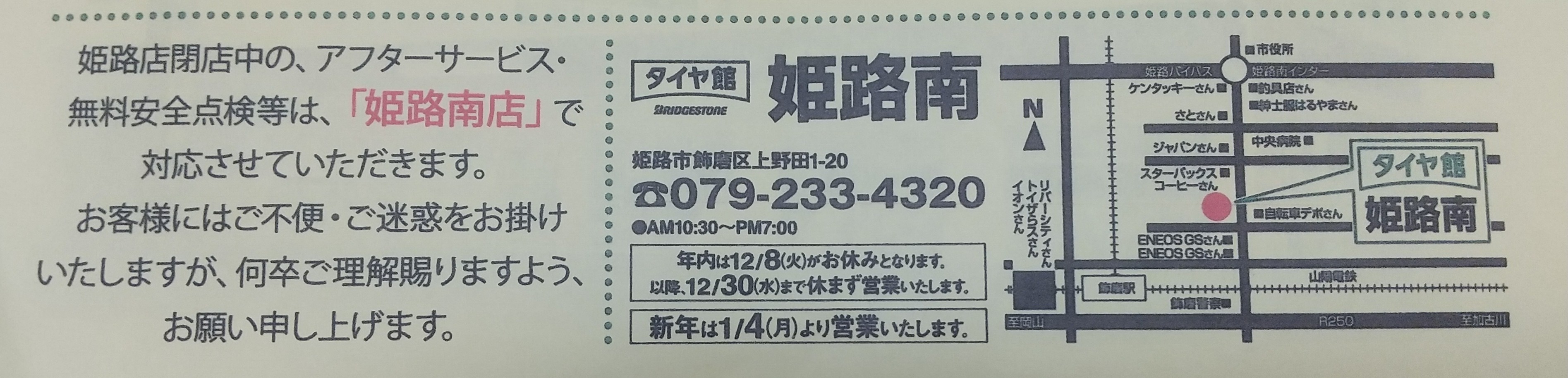 2020年12月31日(木)~2021年1月22日(金)は完全閉店となり、姫路店閉店中の、アフターサービス、安全点検等は、タイヤ館姫路南店にて対応致します。