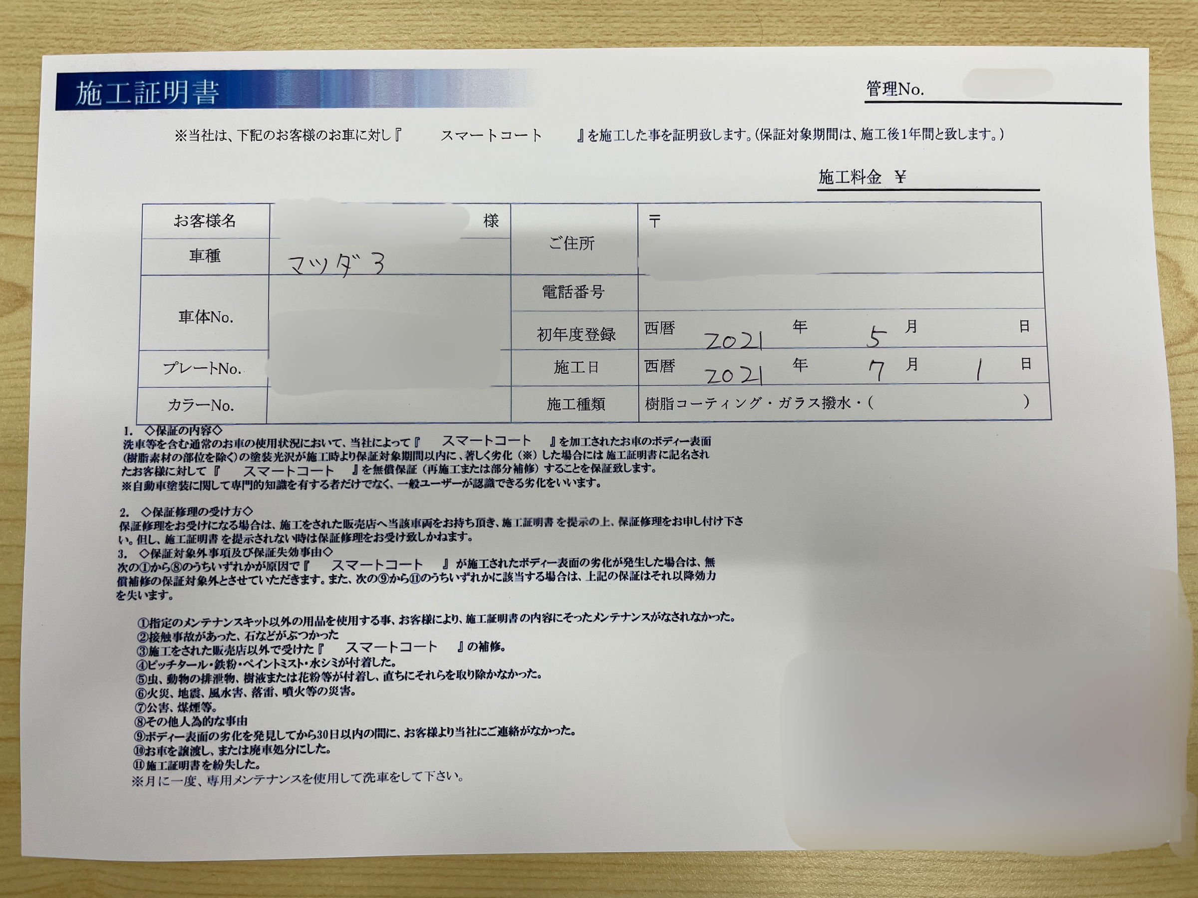 コーティング施工後にはこの様に施工証明書が発行されます。