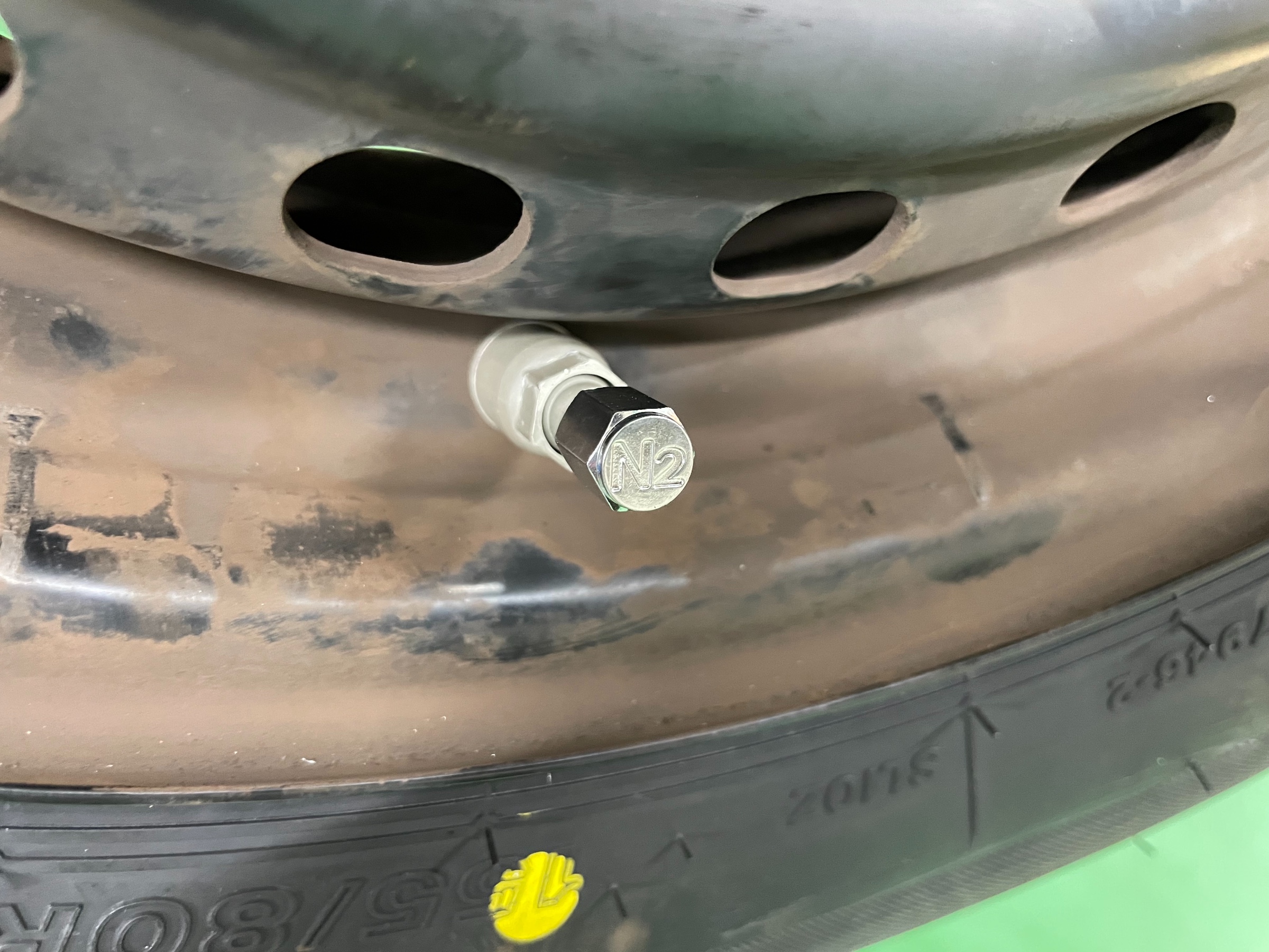 窒素ガスは通常の空気と比べて、タイヤ内圧の自然低下が少ないので、タイヤ内部の圧力をより長く安定した状態に保つ働きがあります。タイヤ館では窒素ガスの充填をお勧めしています。