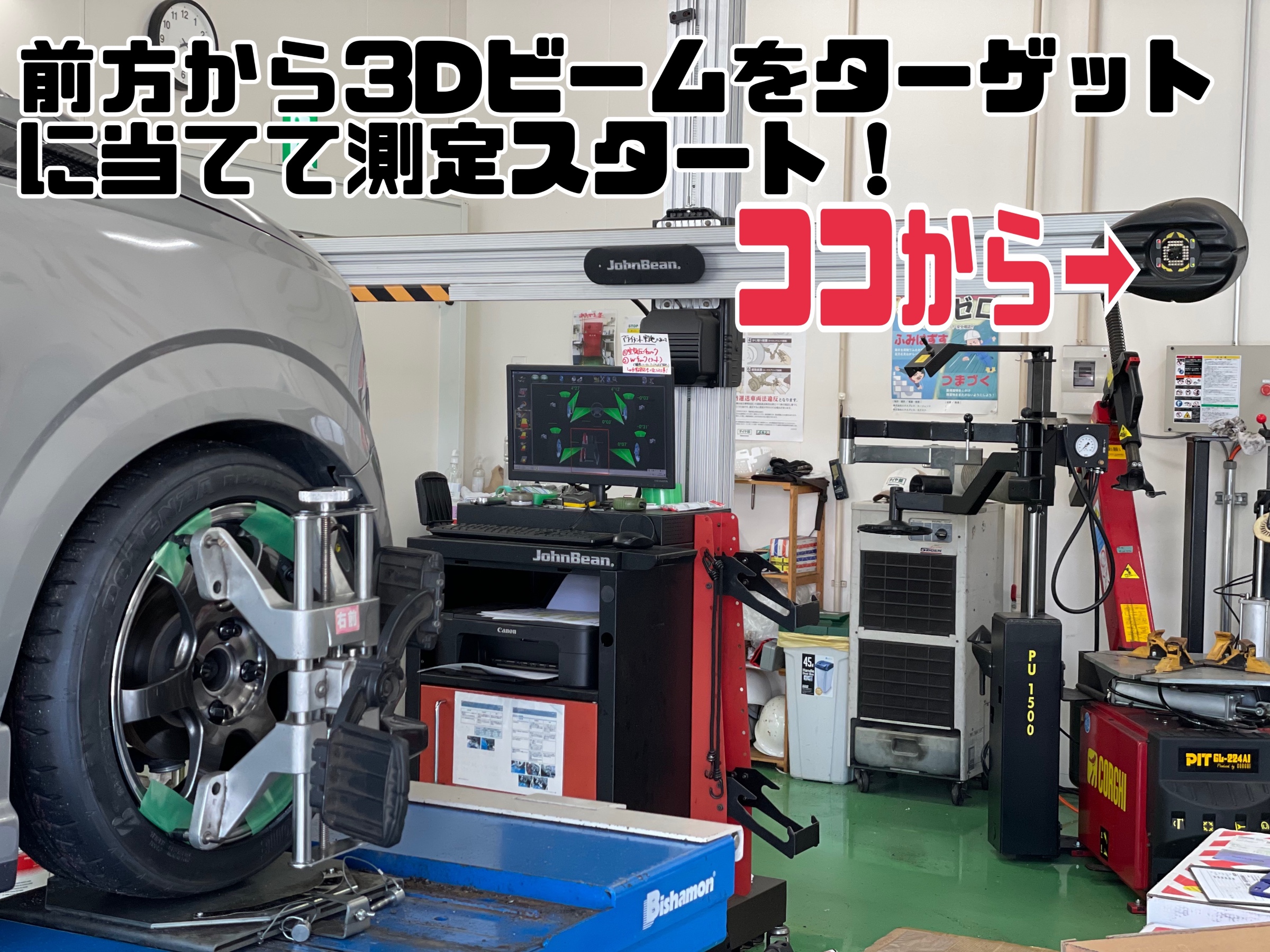 まず、車両の各ホイールにターゲットを装着します。
