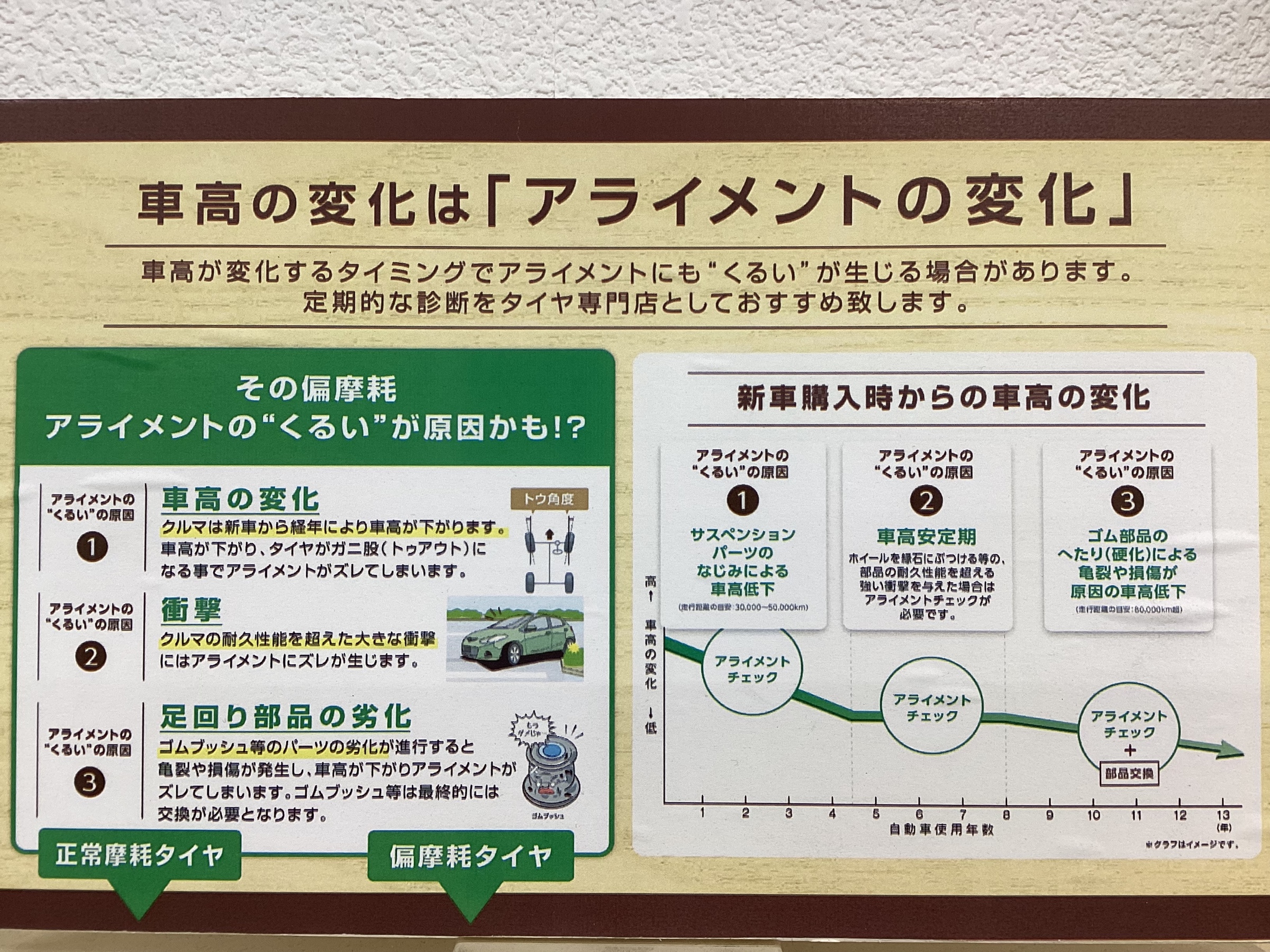 アライメントは衝撃はもちろん、車高の変化でもズレてしまうのです。。
