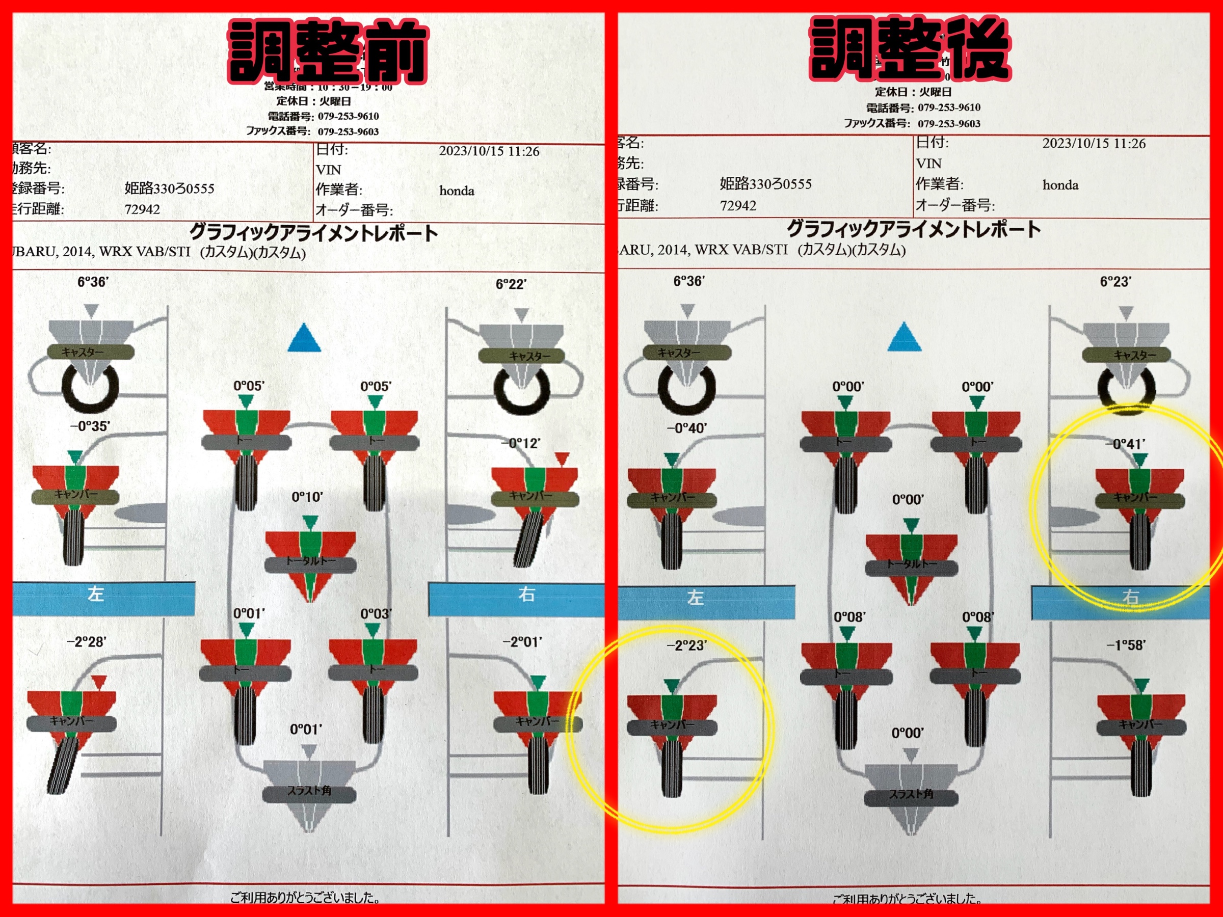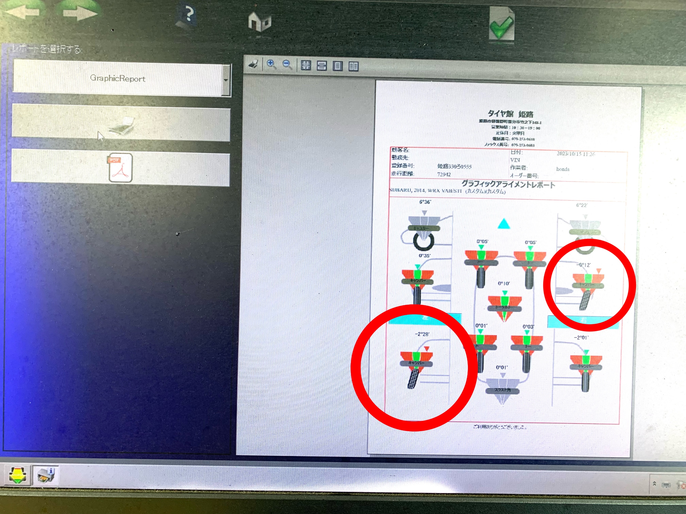 歪んでいた、右前輪と左後輪が規定値(緑の枠内)になりましたね!