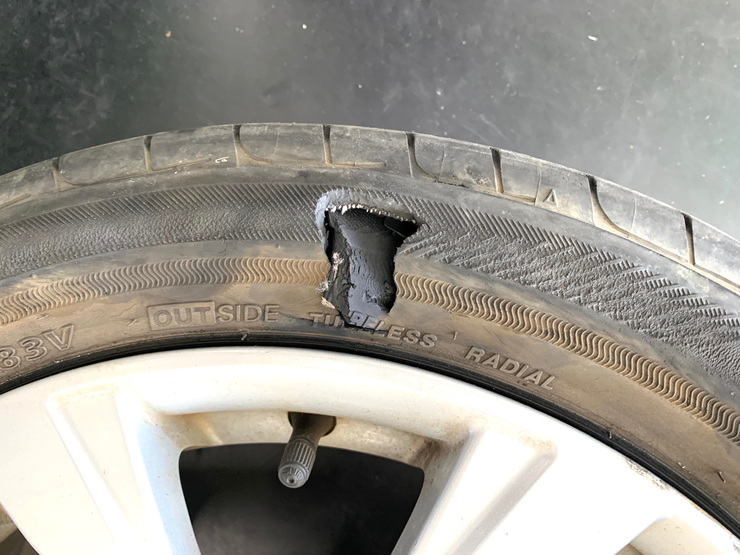 タイヤを見てみると、大きな石を踏んで、ぼっこり大きな穴があいてました((>_< ;)
