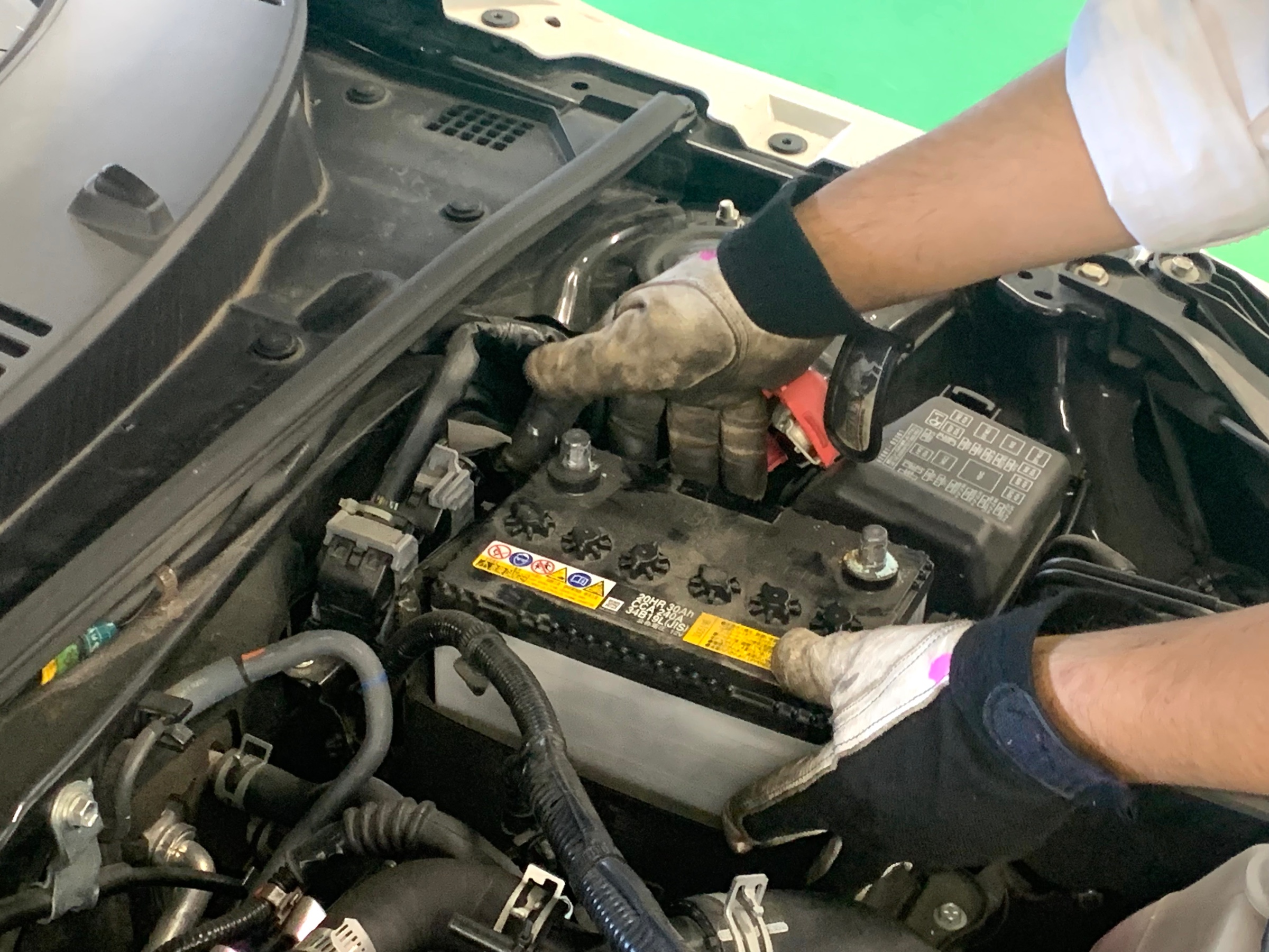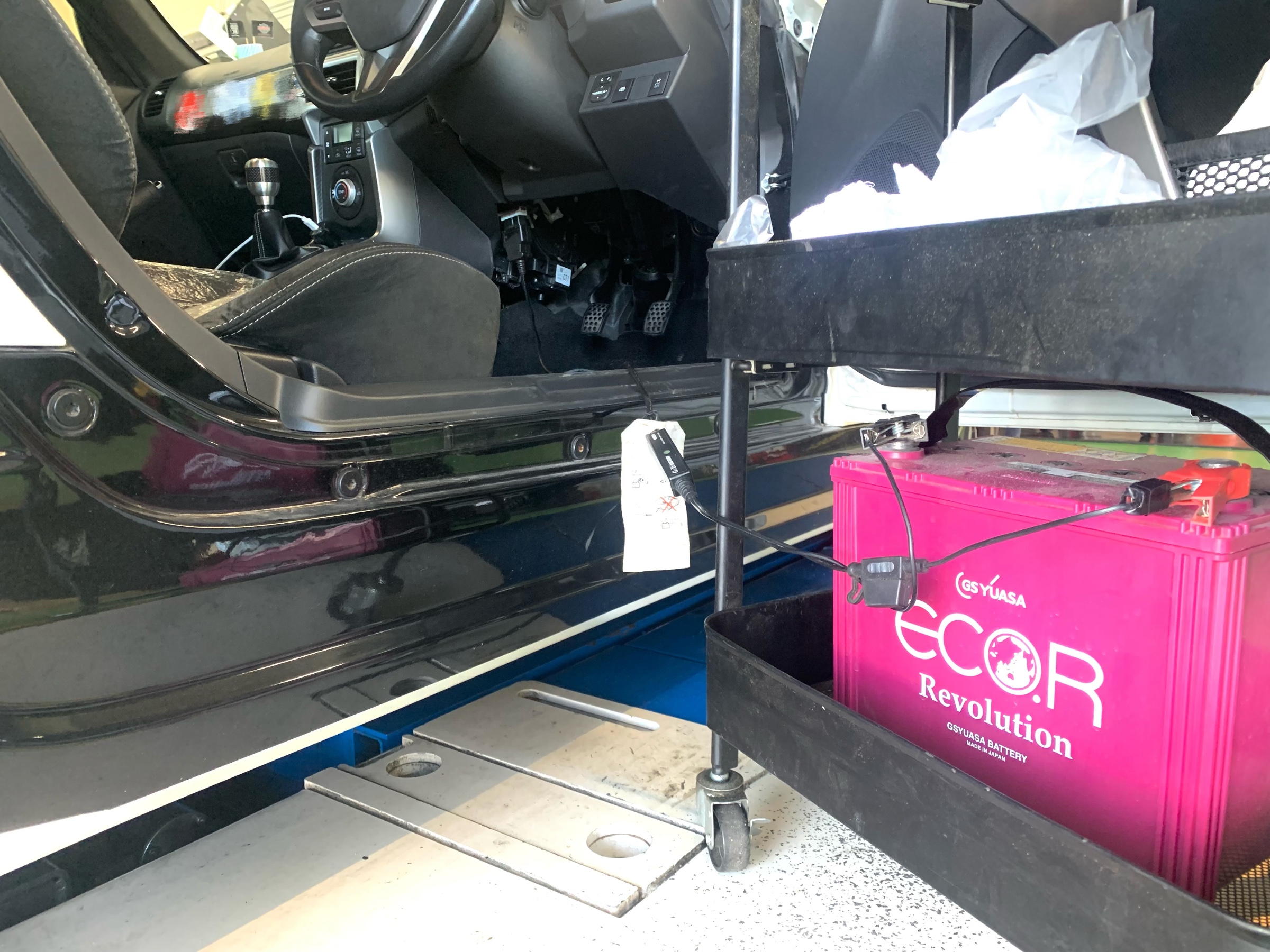 まずは予備バッテリーで、現在の車のデータなどがクリアされないように、バックアップを取ります!