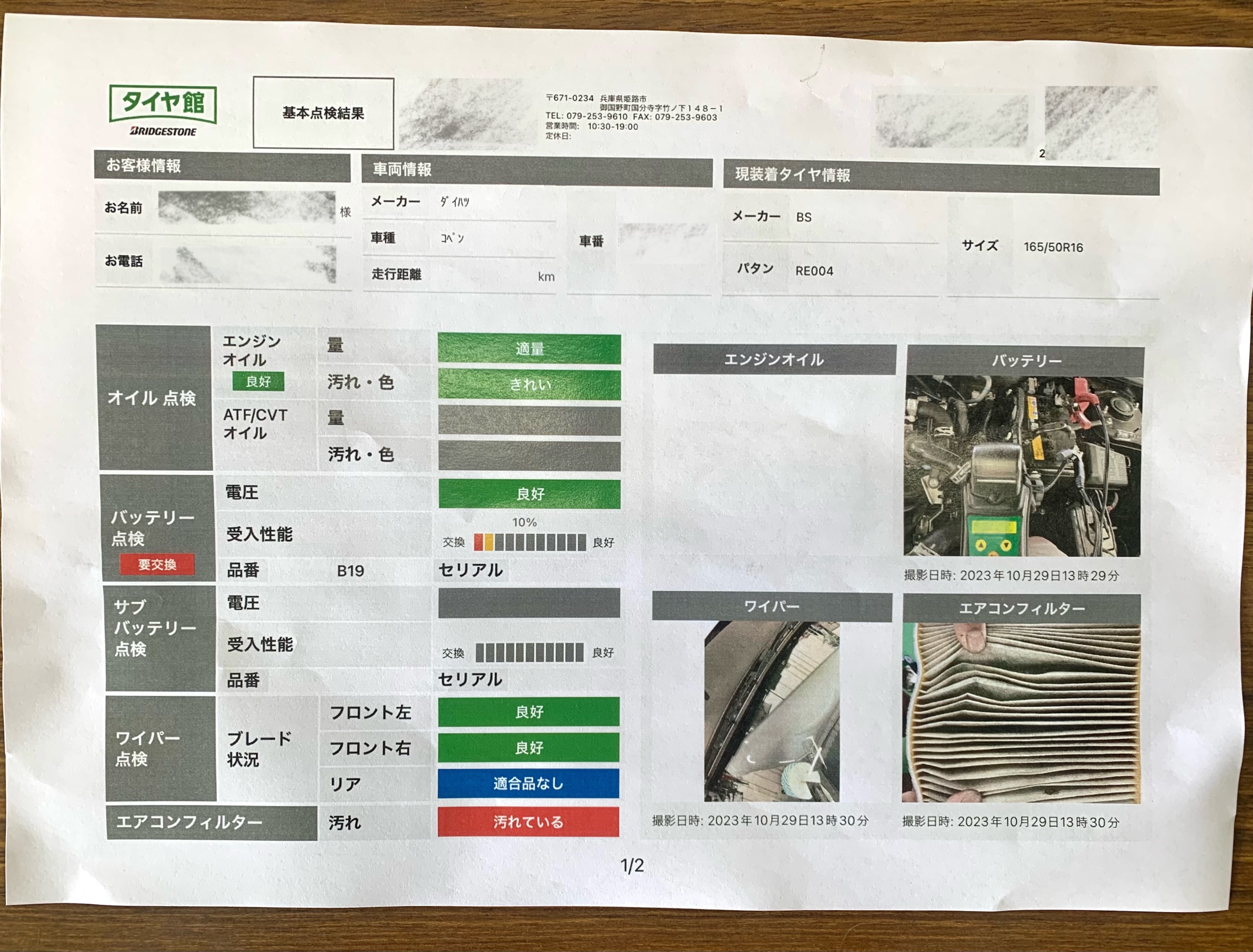 エアコンフィルターの状態とバッテリーの数値が良くないですね( ˊᵕˋ ;)