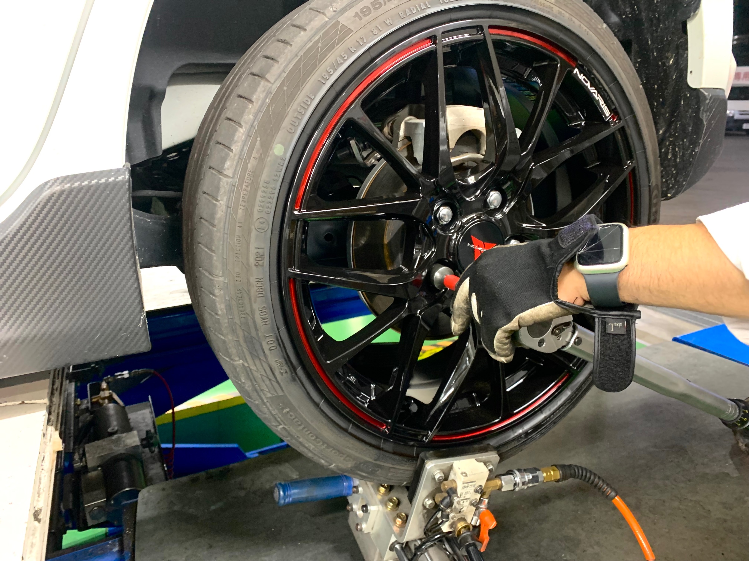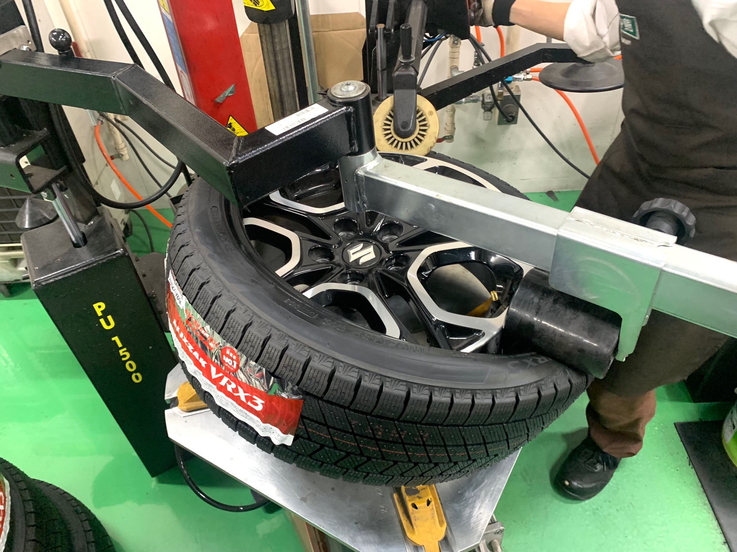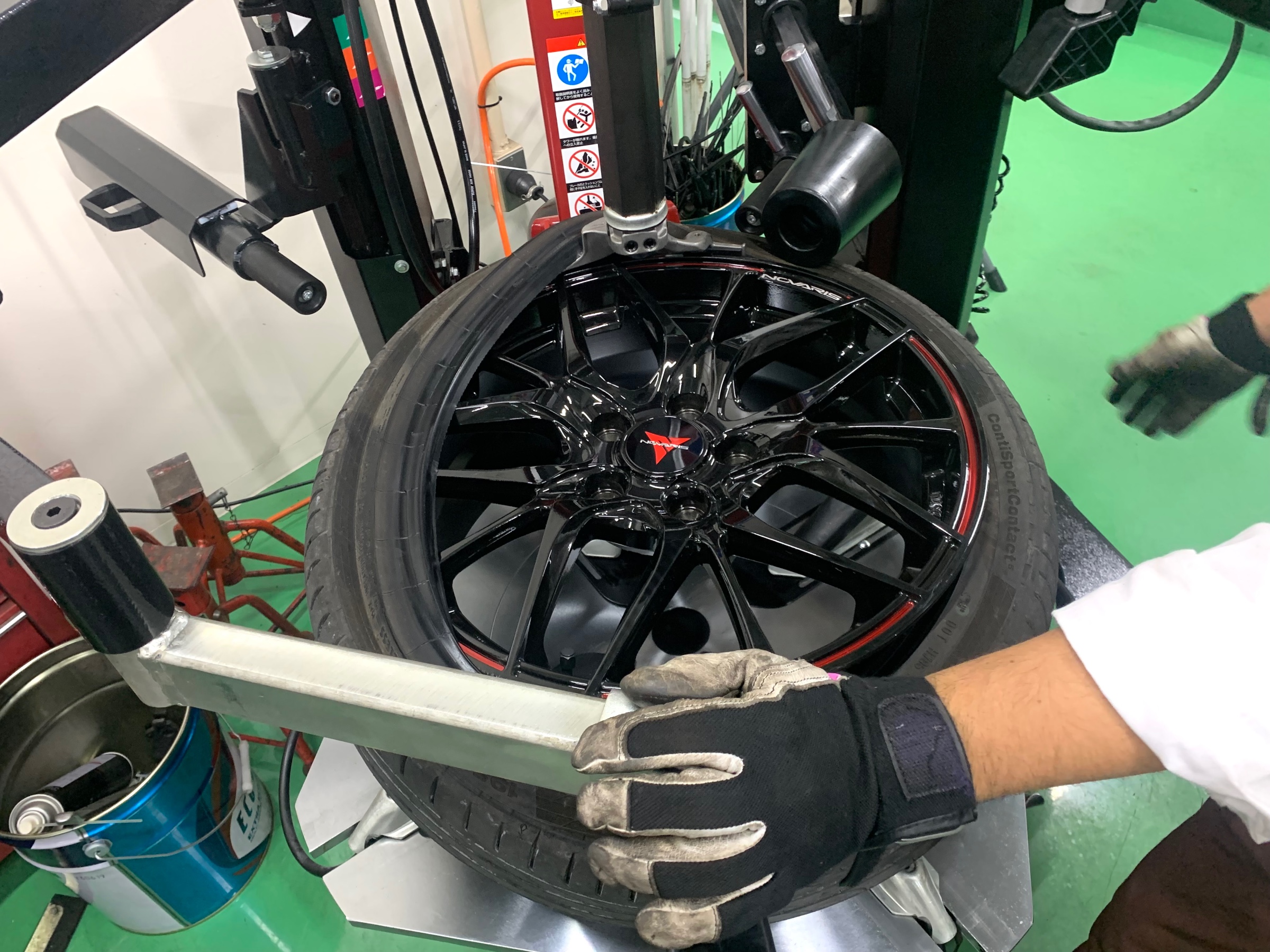 ↑タイヤ館こだわりの、センターフィットサービスで取り付け中↑