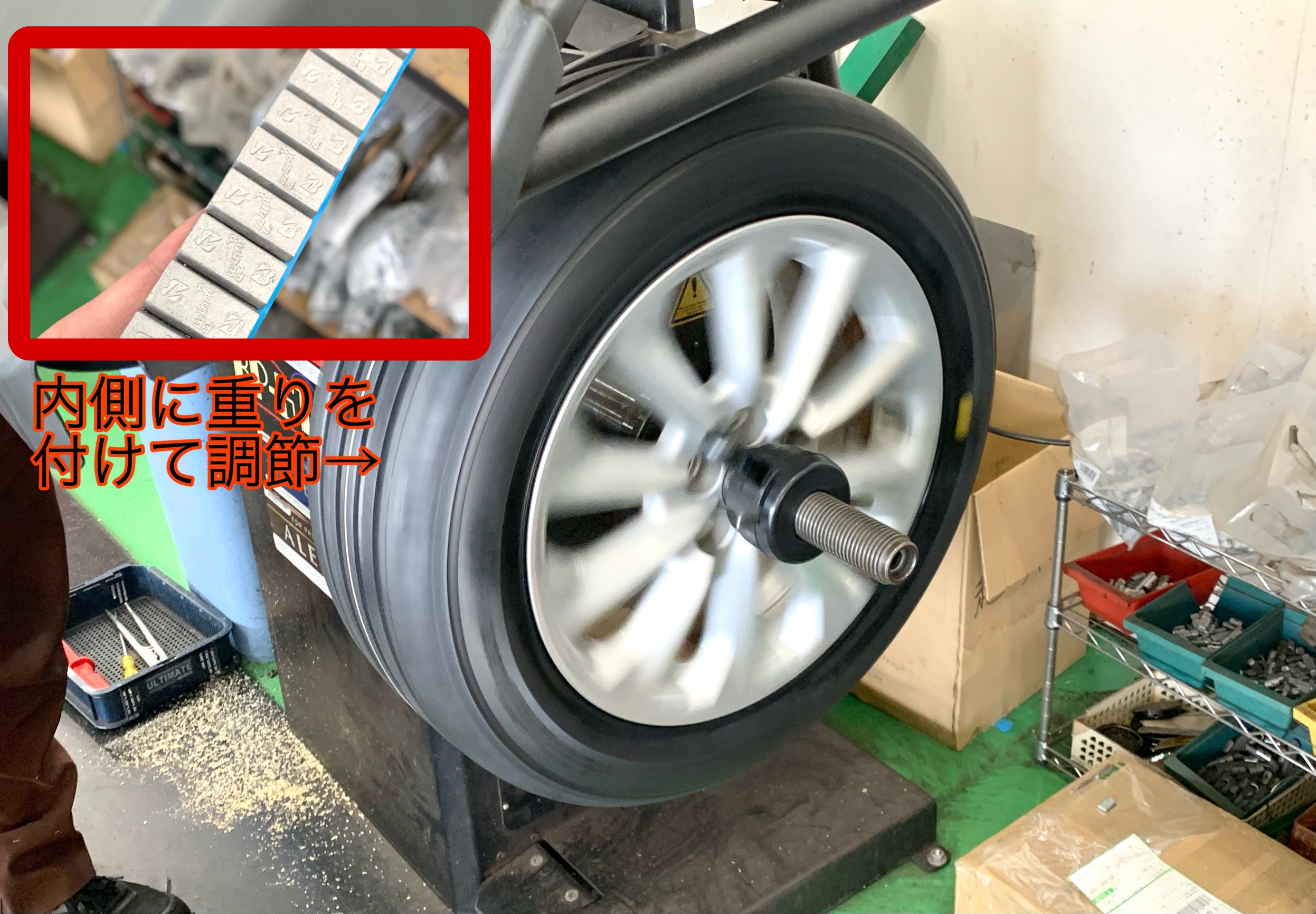 新しいタイヤを履いたホイールのバランスをとって