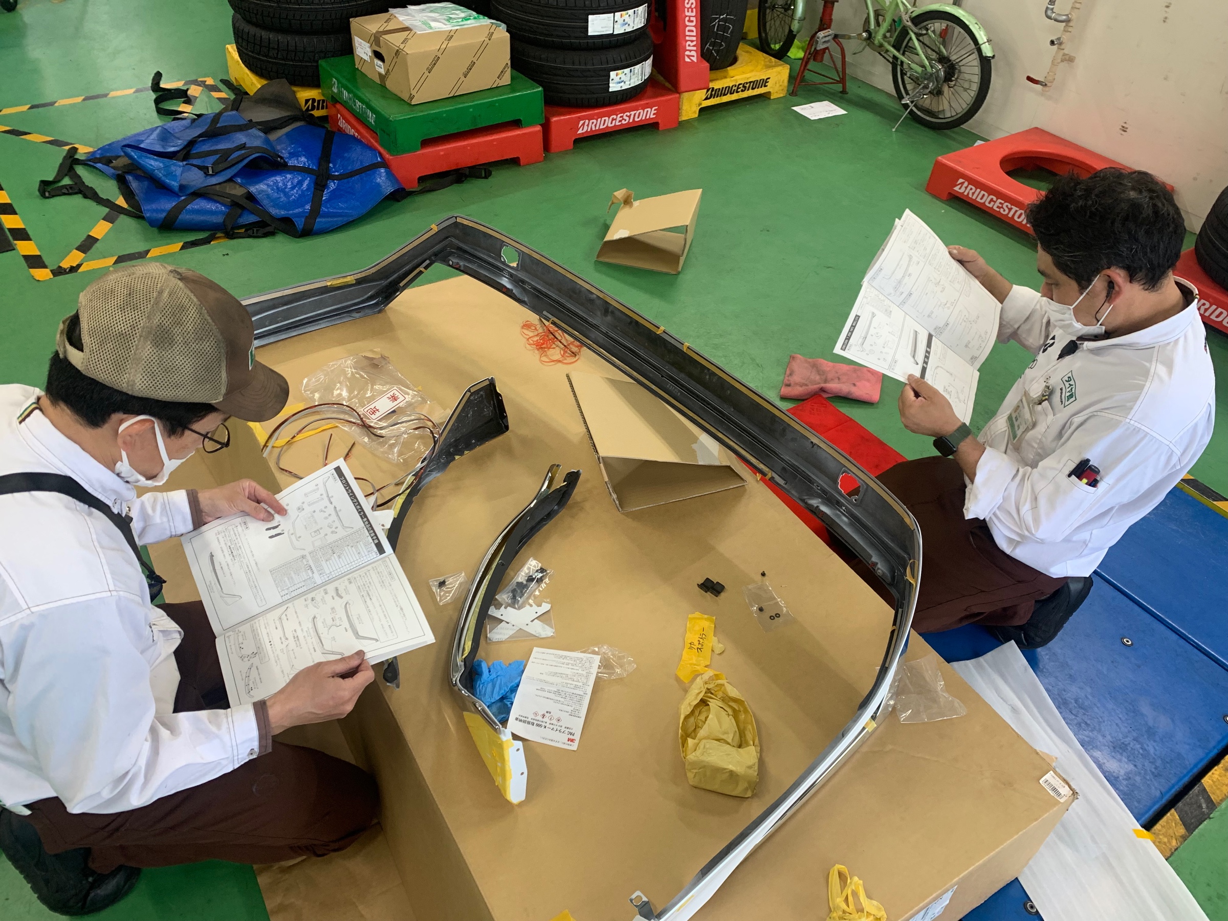 ↑取付に必要なパーツの組立中、説明書を熟読する本多店長と宮前主任
