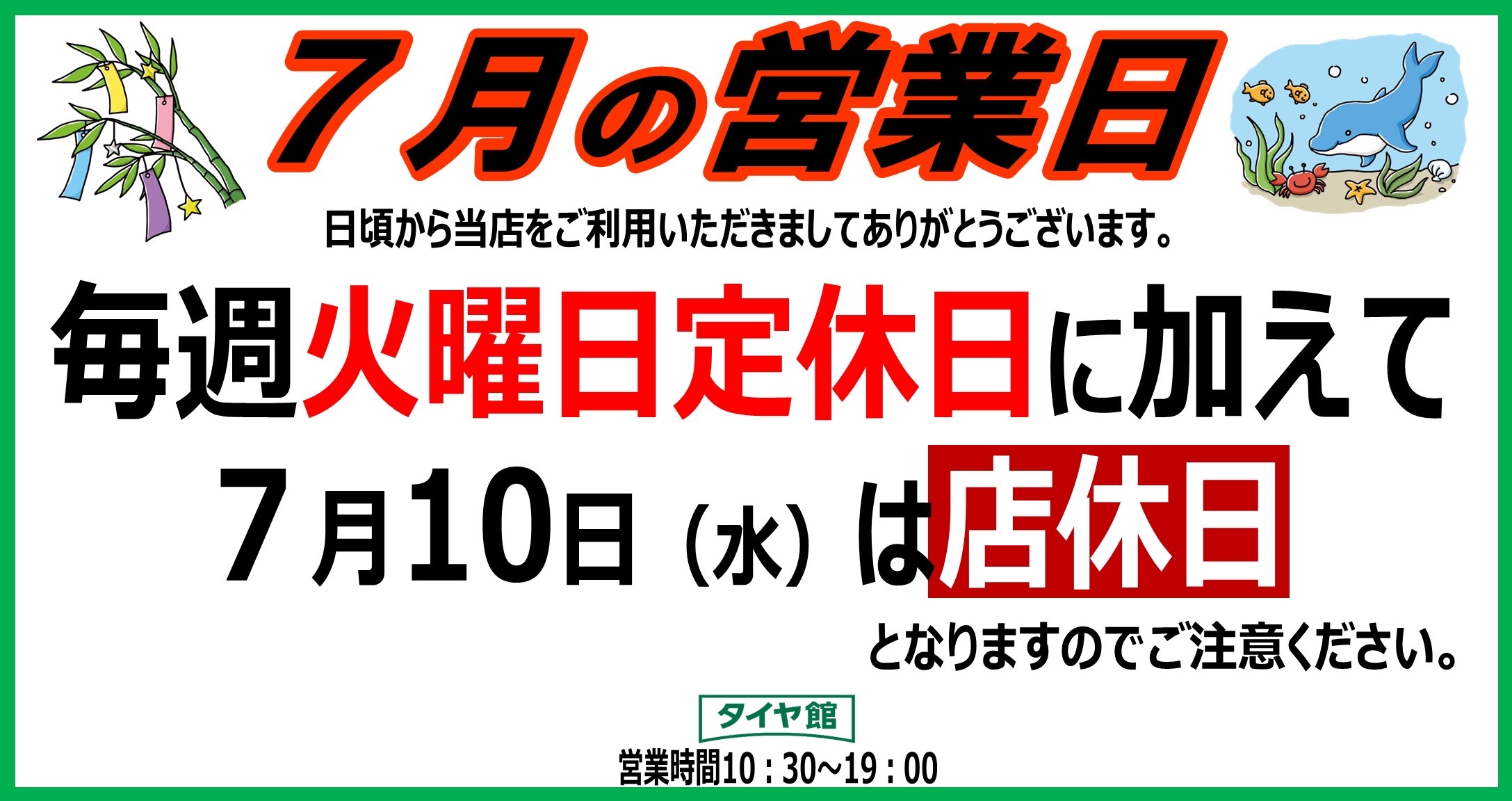 毎週火曜日の定休日に加えて、本日7/10 (水)も