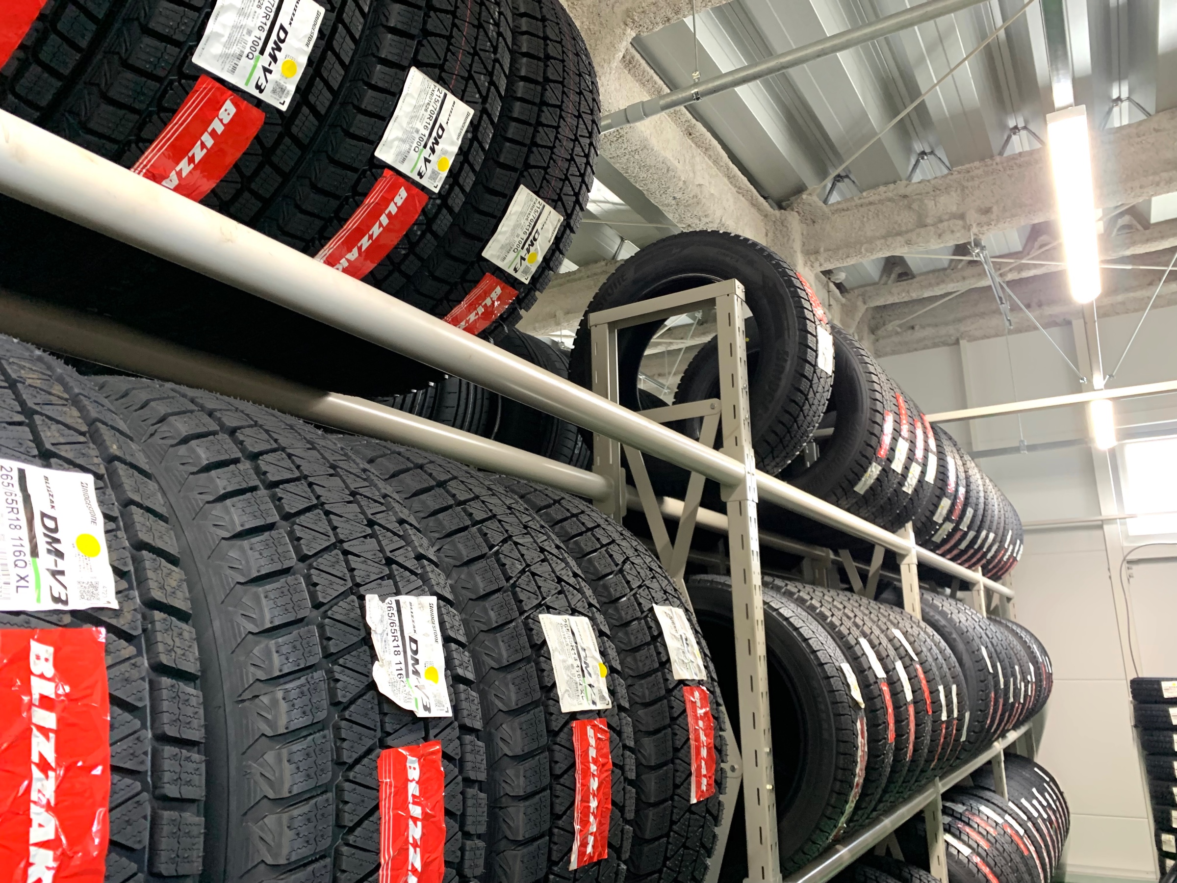 当店の2階にある大きな倉庫には多種多様なサイズのスタッドレスタイヤがぐーすか眠っております……。