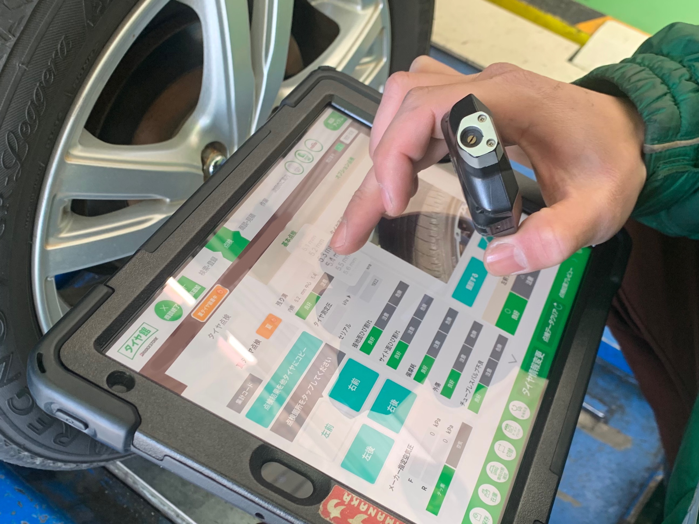 タブレットを使い、継続利用の可否、残り溝の測定等を行い、「あとどれ位使えるのか」「長持ちのアドバイス」をわかりやすくご説明。