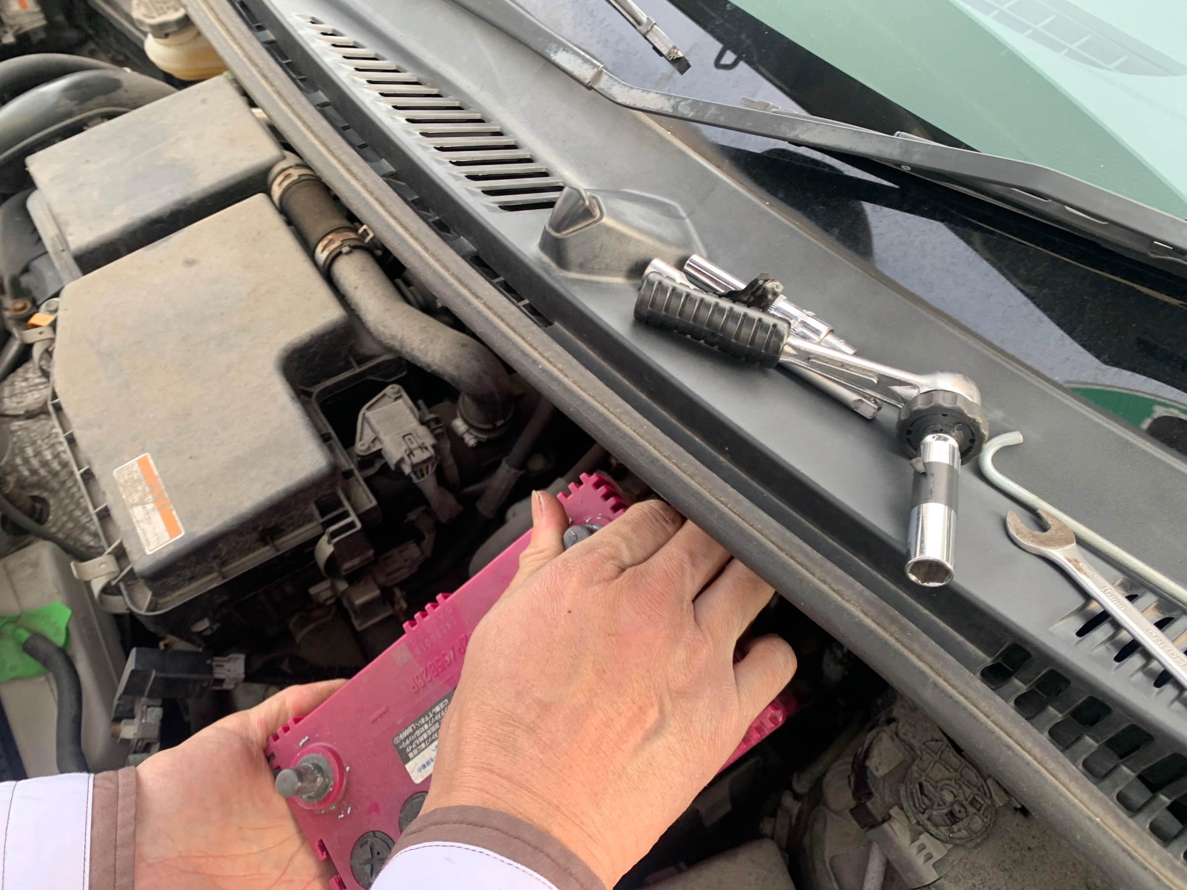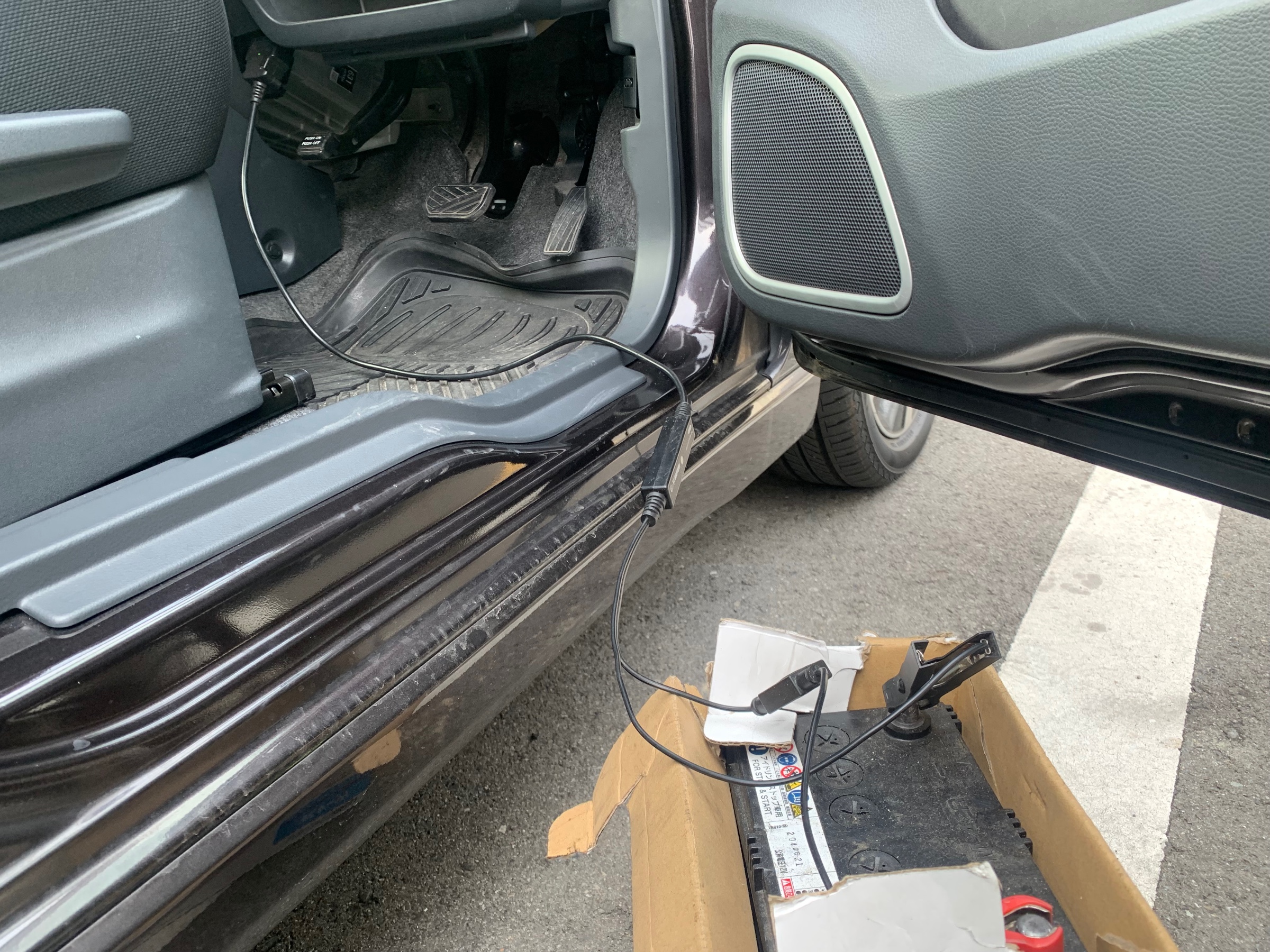 ↑クルマのデータが飛ばないように、バックアップバッテリーに繋いでから作業を始めます
