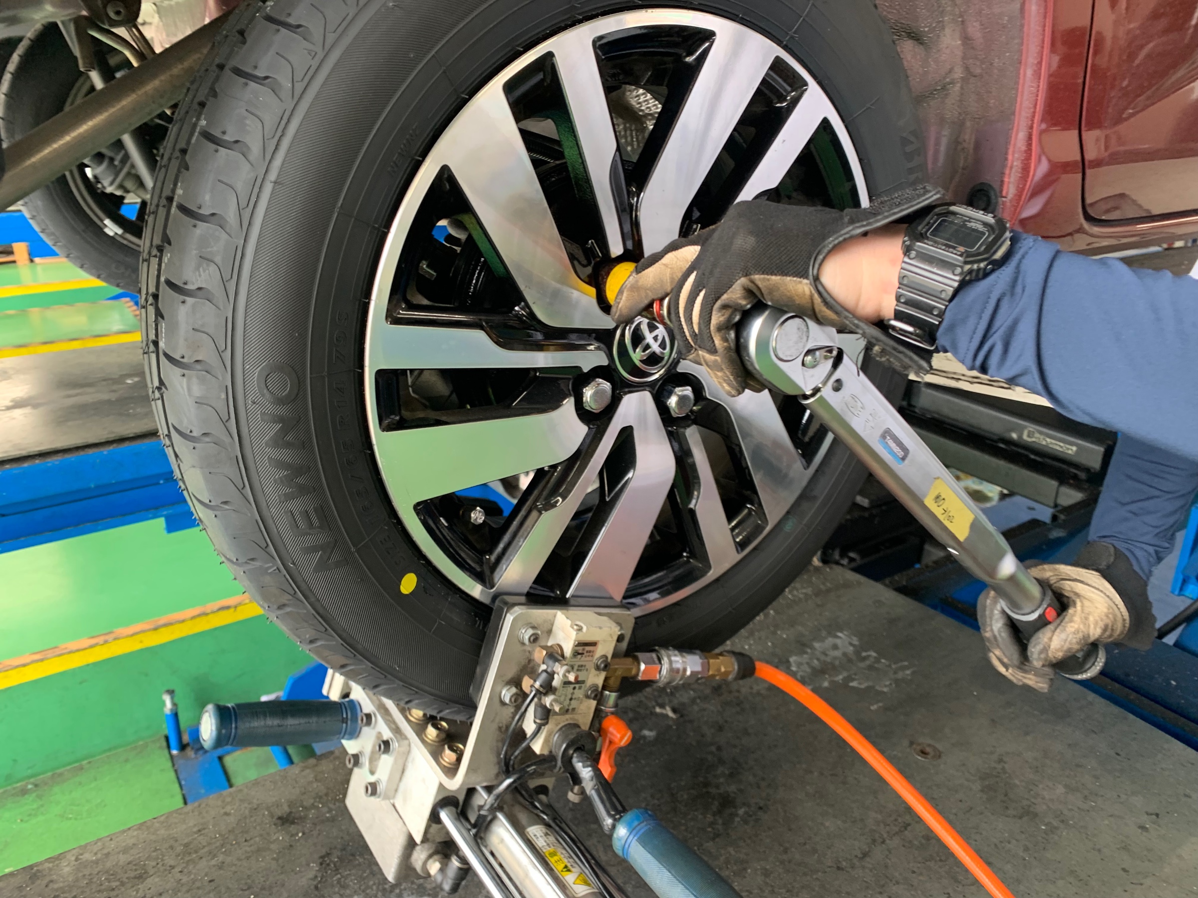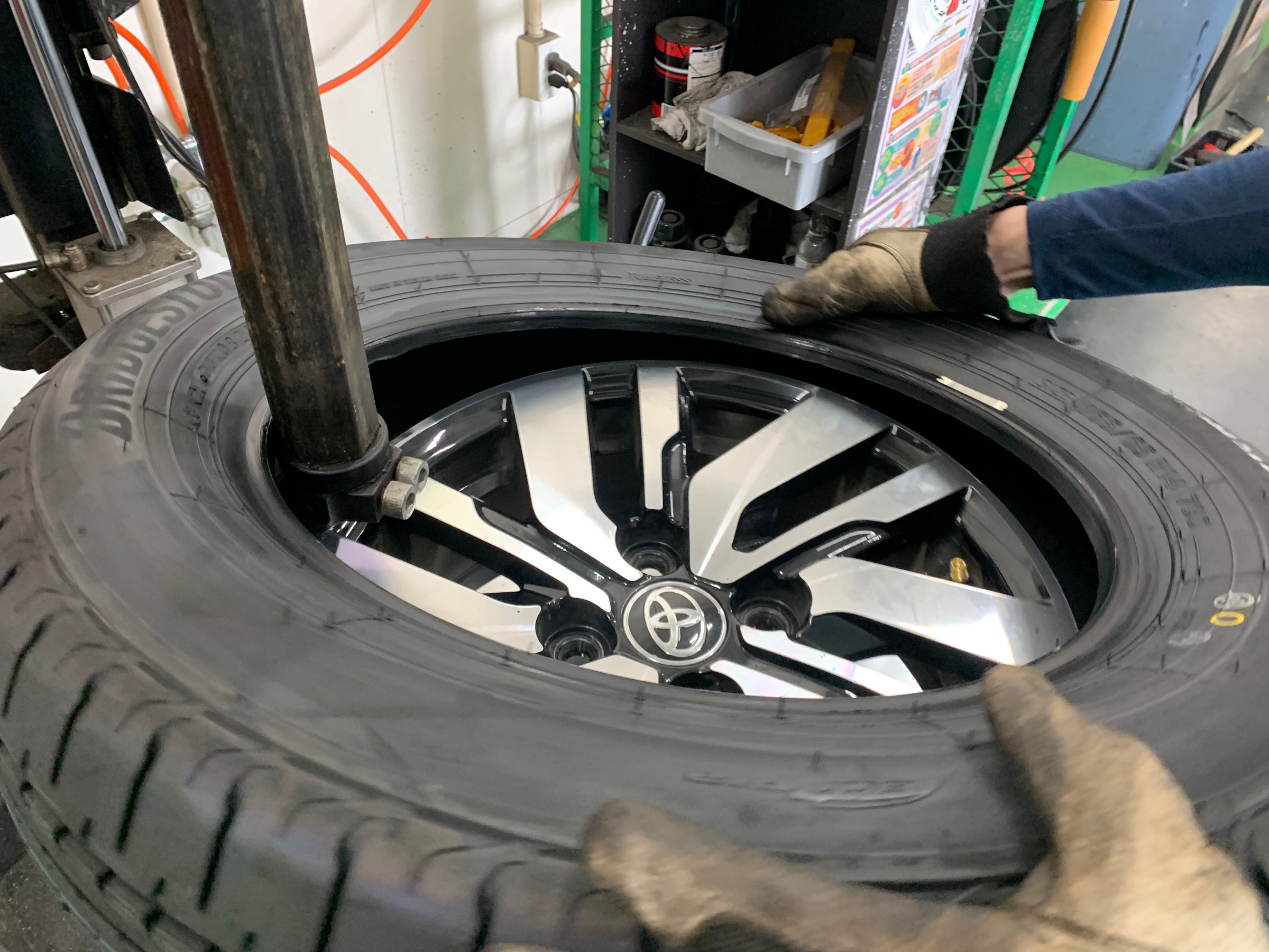 ↑タイヤチェンジャーを使い、素早く丁寧に組み替えていきます