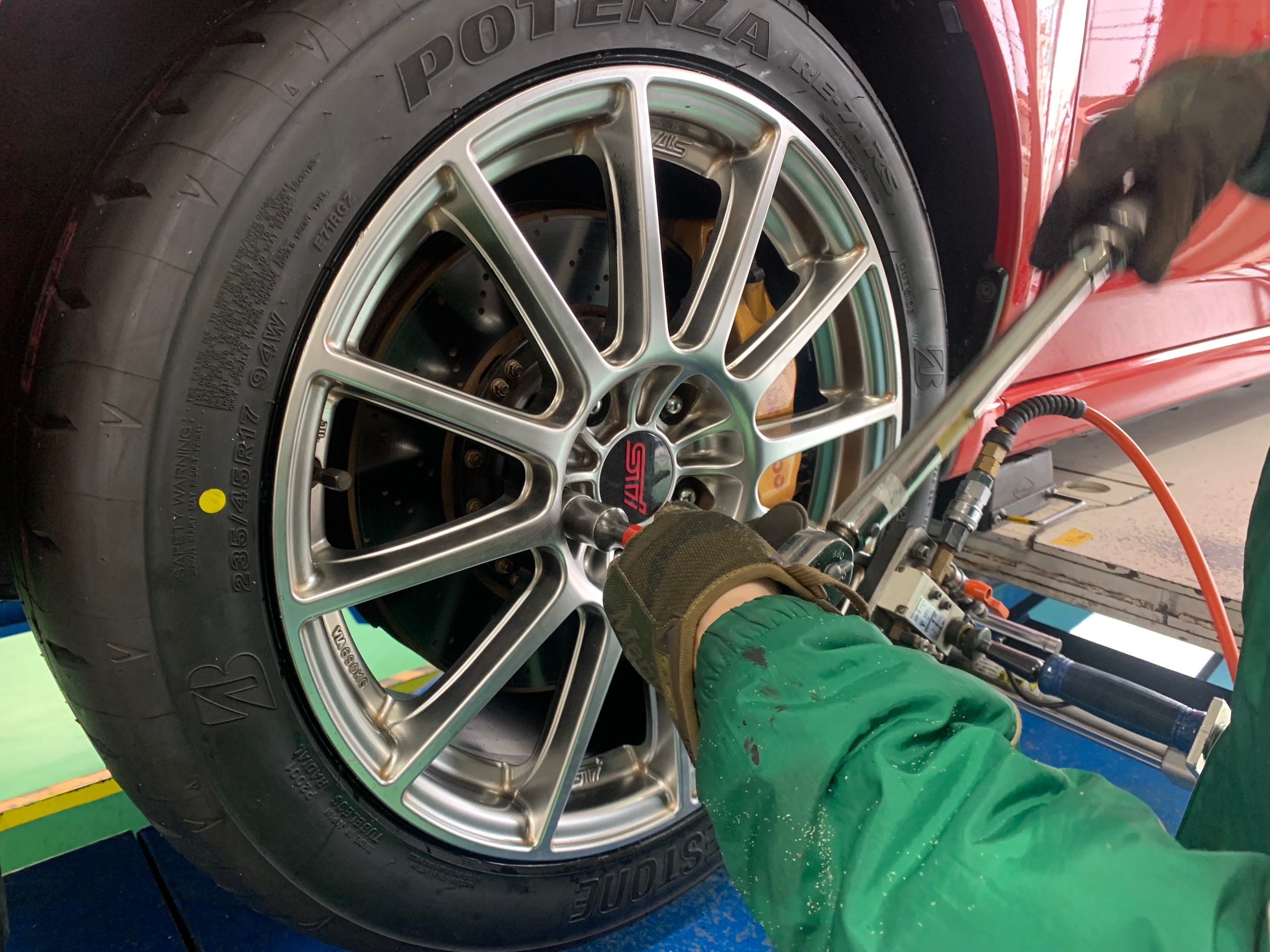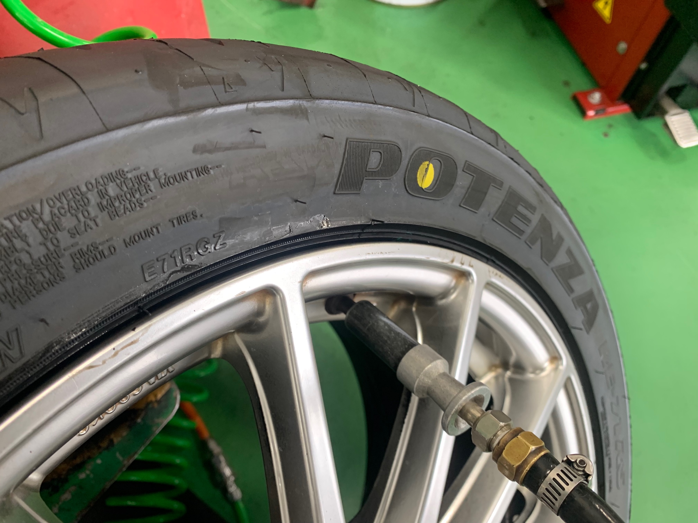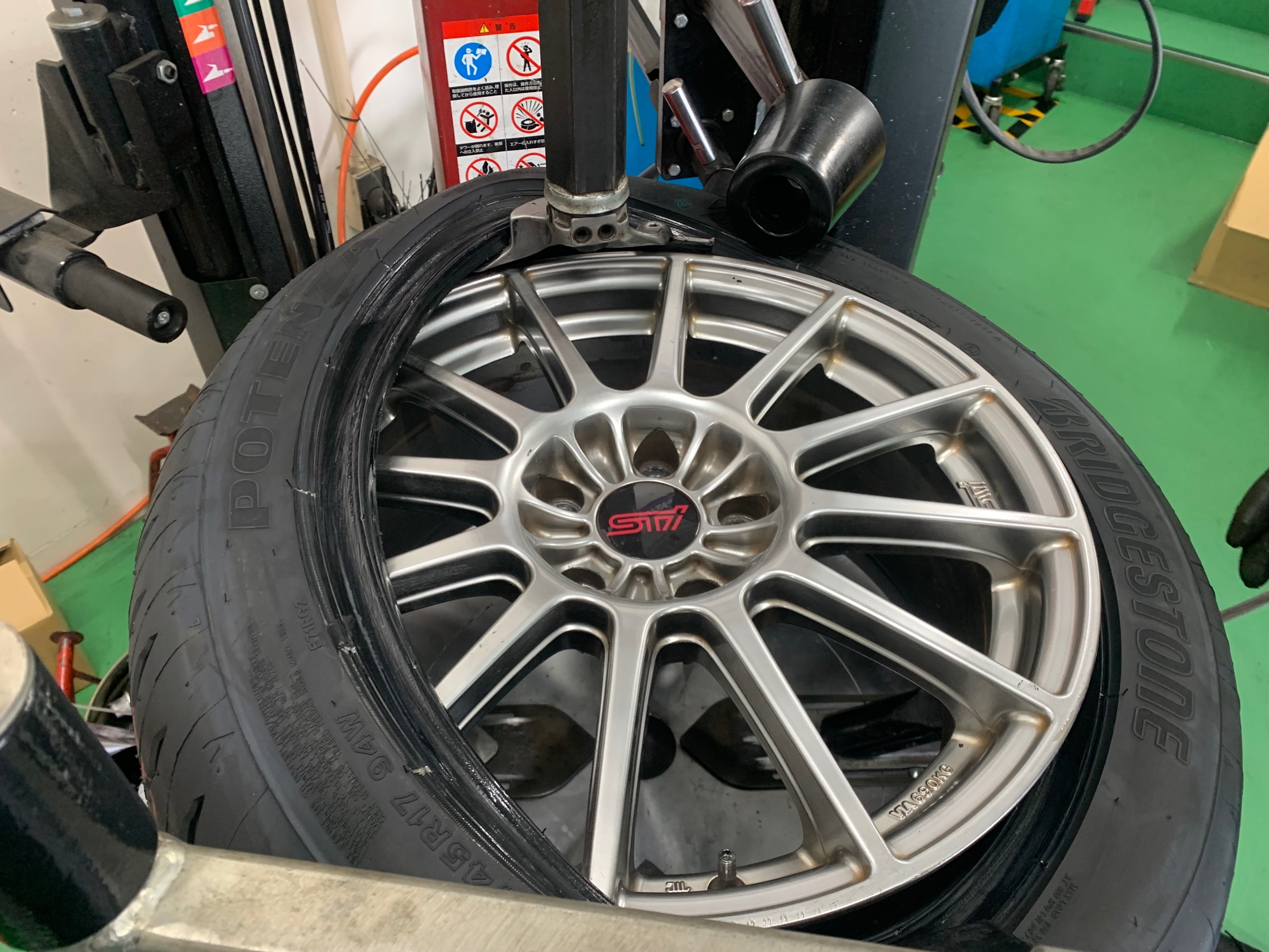 ポテンザあるあるの、ありとあらゆる機械を使って組み替え(タイヤの輪っかの所が硬い材質なので一筋縄ではいかないんです・・・)
