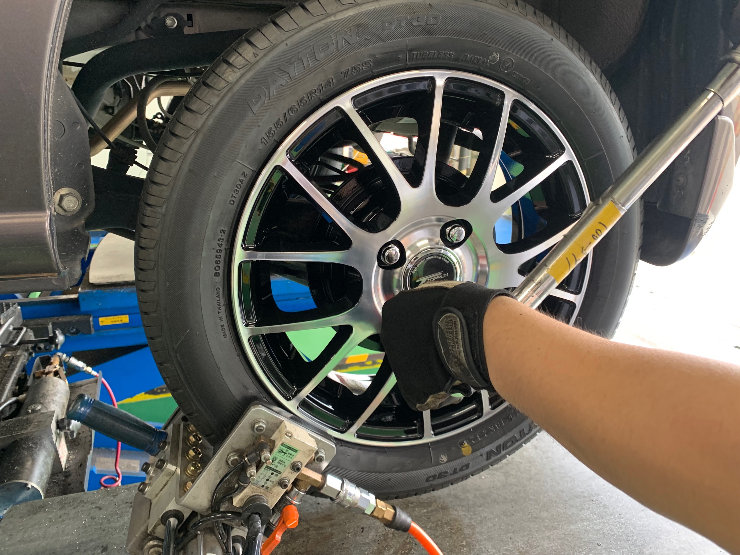 ↑特殊な機械でタイヤを振動させながら、取り付け面の真ん中にて締めつけを行うことで、走行中の振動を抑制します