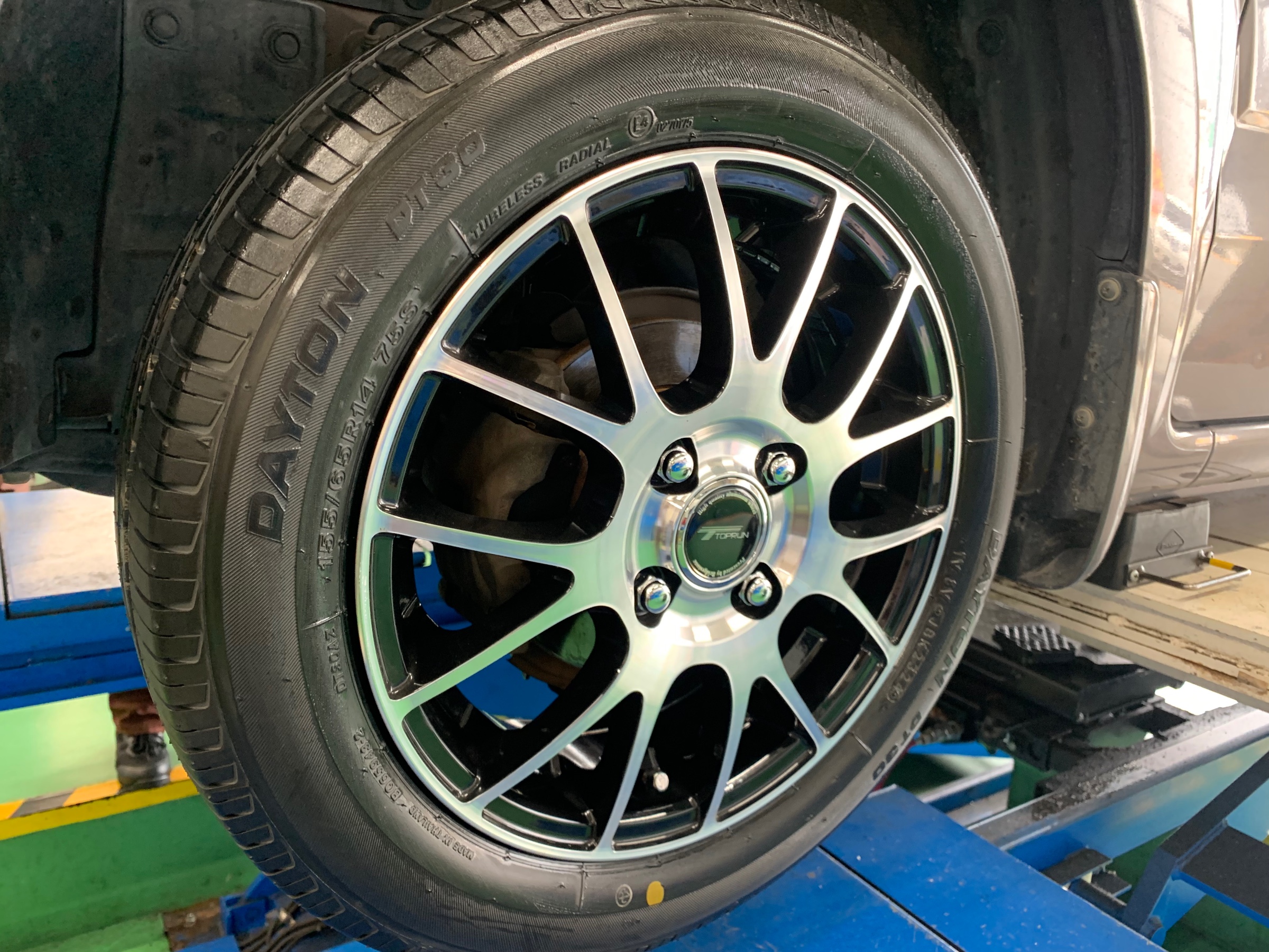 鉄チン13インチホイールからアルミ14インチホイールになり、色合いもシルバーから黒基調になったことでずっしりと高級感のある足元になりましたね!