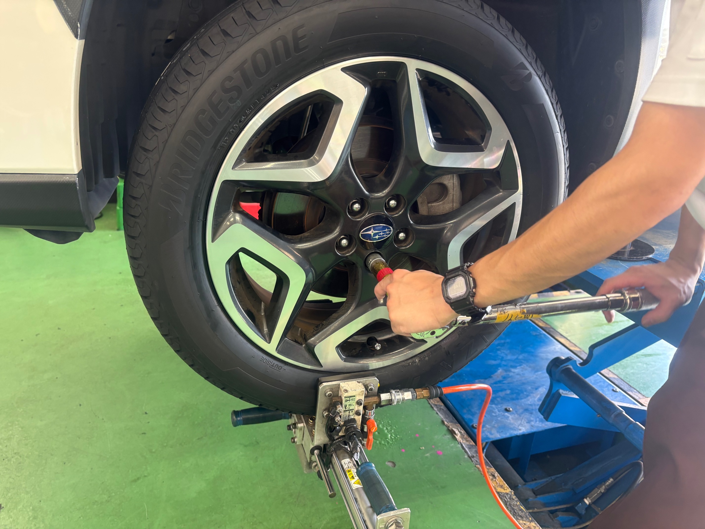 ↑特殊な機械でタイヤを振動させながら、取り付け面の真ん中にて締めつけを行うことで、走行中の振動を抑制します