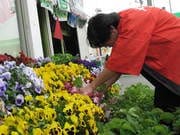 姫路店自慢?のお花の前で三角座りで切ない目をしている