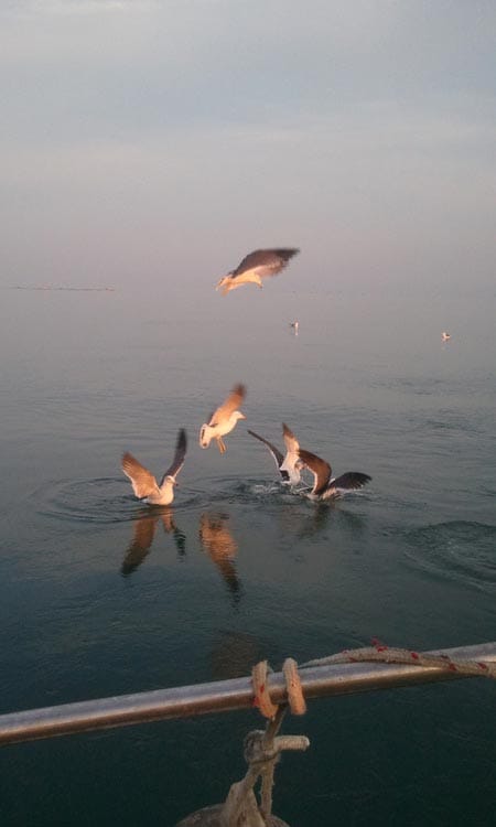 投げたパンくずに集まるように、投げた肝に群がるカモメ達