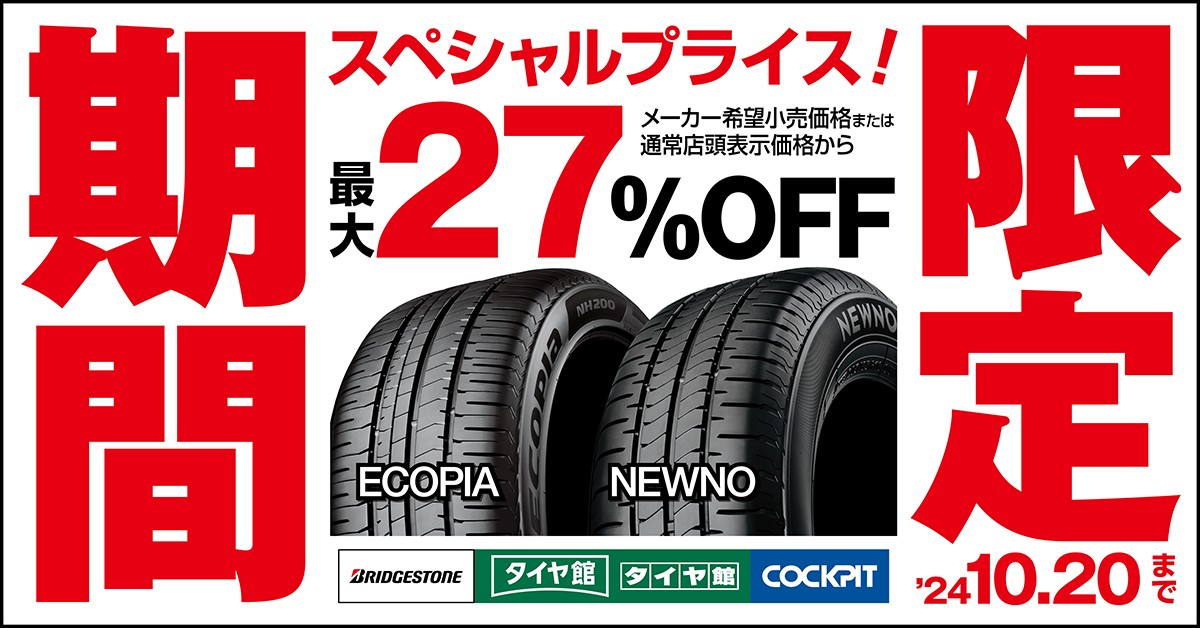 こんにちは、いつも当店をご利用いただきましてありがとうございます。 本日は、いつもご利用いただいているお客様に、お得な情報のお知らせです。 現在、コクピット・タイヤ館の一部店舗におきまして、 期間限定! サイズ限定!! 数量限定!!! で、ECOPIAとNEWNOをスペシャルプライスでご提供中...