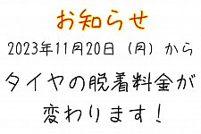 みなさん、こんにちは! 山中ちゃんですd('∀'*) 今日はとてもとても大切なお知らせとなっておりますので、サムネイルがいつもとちがいます! 表題通り、2023年11月20日より、タイヤ脱着料金の改定をいたします。 いつも当店をご利用いただいておりますお客様には大変ご迷惑をおかけいたしますが、何...