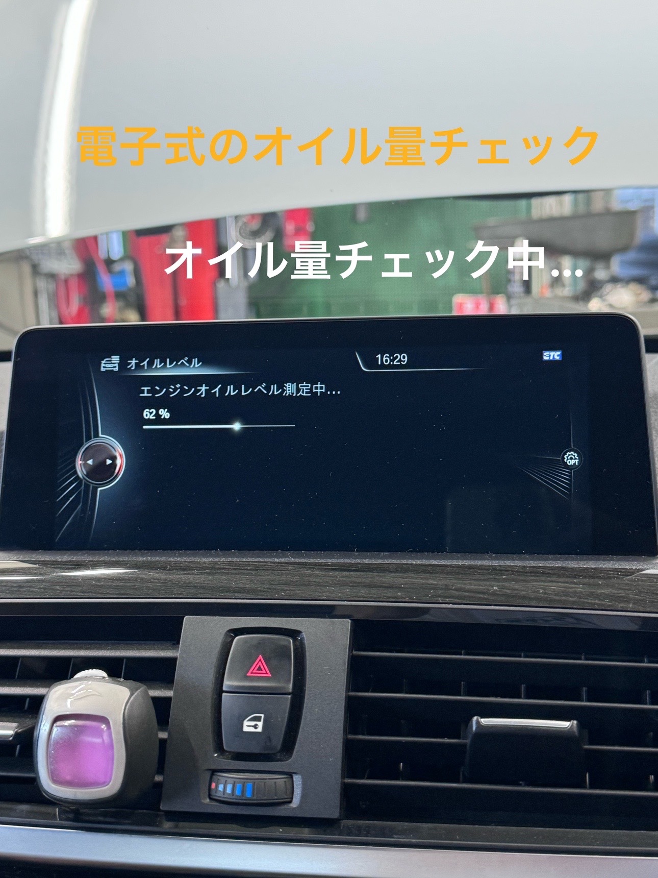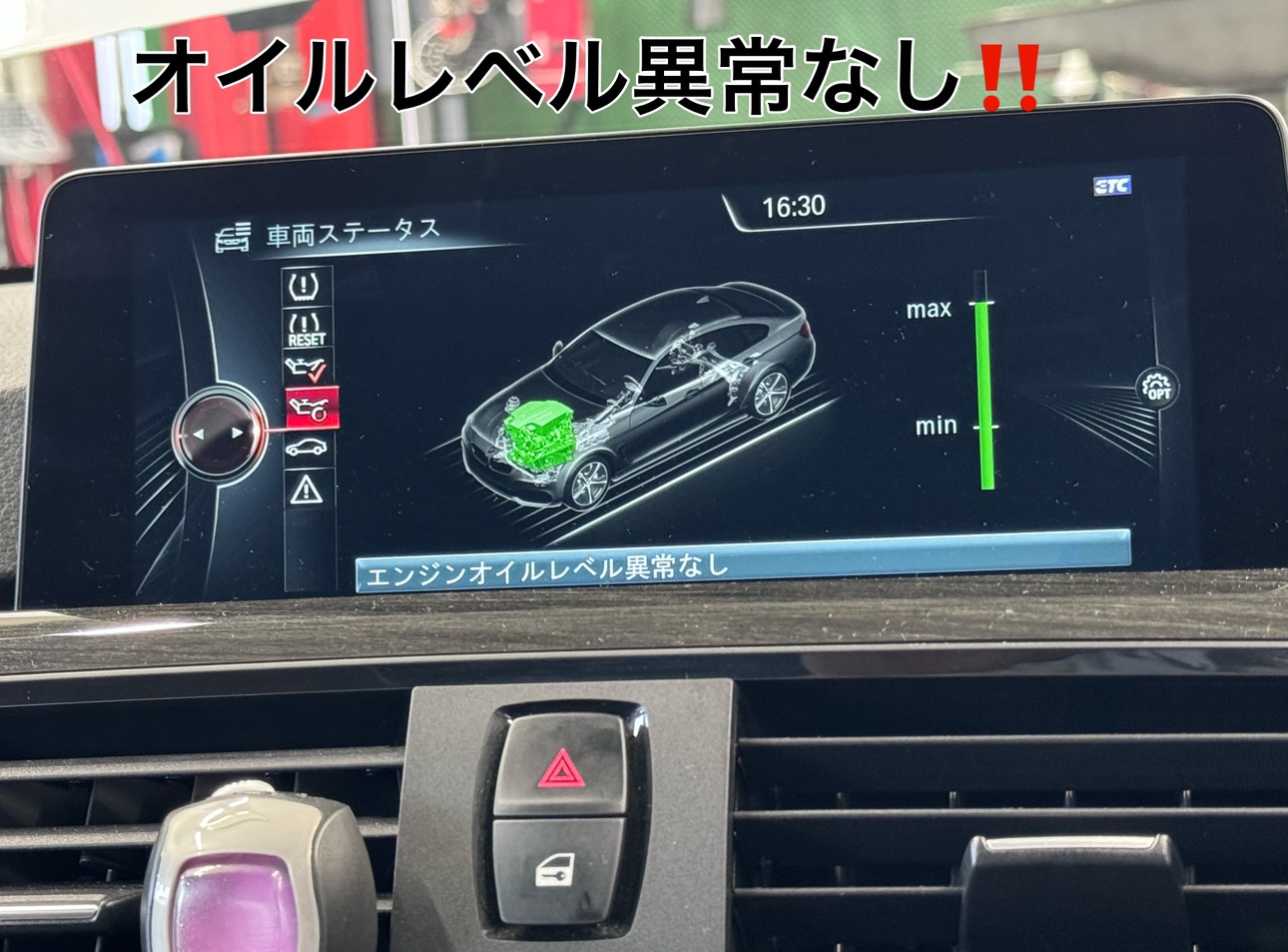 こちらのお車はオイルゲージレス車両ですので車内のモニターにてエンジンオイルレベルを測定します!この際にもう一度ドレンボルトのトルクチェックとオイル漏れの点検も行います。