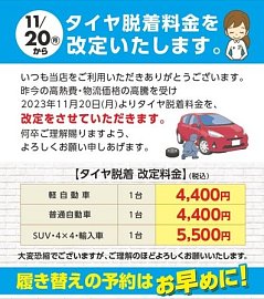 いつもタイヤ館姫路中央店のホームページをご覧いただき ありがとうございます! 秋祭りの時期になり、より肌寒くなってきましたよね~。 冬の足跡が聞こえて始めてきました!! タイヤ脱着料金についてのご案内となります。 上記の通り11/20(月)より タイヤ脱着料金を改定させて頂きます。 軽自...
