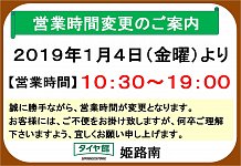 いつも、タイヤ館 姫路南をご利用いただき、本当にありがとうございます。 誠に勝手ながら、2019年1月4日より営業時間が変更となりますので、下記の通りご案内申し上げます。 お客様には、ご不便をお掛け致しますが、何卒ご理解ご協力くださいますようお願い申し上げます。 2019年も変わらぬ...
