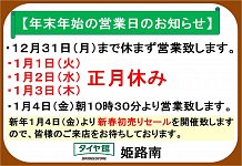 旧年中は大変お世話になりました。本年もタイヤ館 姫路南をどうぞよろしくお願い申し上げます。 タイヤ館 姫路南の1月の定休日は、 1日(火曜日) 2日(水曜日) 3日(木曜日) 8日(火曜日) 15日(火曜日) 22日(火曜日) 29日(火曜日) が定休日となります。 営業時間も1月4日よ...