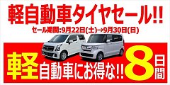 2018年9月8日(土)~9月30日(日)の間 !!【決算セール】開催中です!!その中でも9月22日(土)~9月30日(月)は軽自動車・コンパクトタイヤがお買得な8日間 となっております!! もちろんその他商品も決算価格にてご奉仕中です! この機会をお見逃しなく! WEBチラシはコチラをクリックしてくださ...