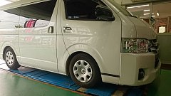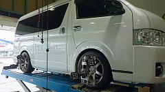 本日の作業事例のご紹介は、ハイエース(ワイドボディ)です。 取り付け部品はアルミホイールとローダウンキットです。 アルミホイールは、ギブソン製カミュラのブロンズカラー。 ローダウンキットは、リムコーポレーション製品で、ランチョの減衰力調整式ショック、トーションバーやダウンブロック...