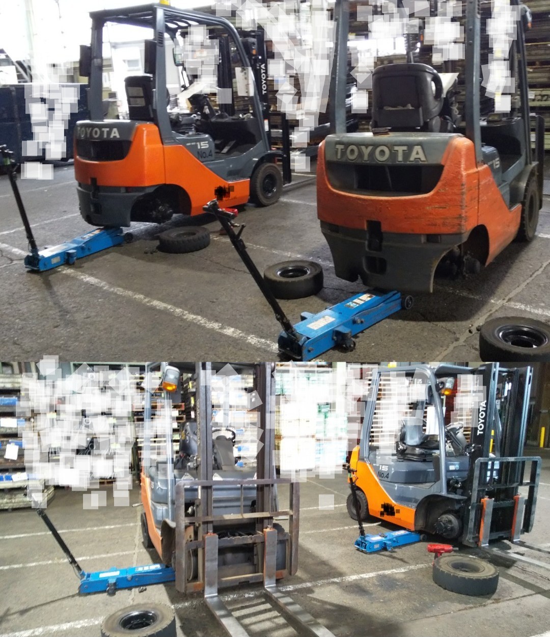 今回は車両入替で出しちゃうフォークリフトのタイヤがまだ溝あるので、溝のない別のフォークリフトのタイヤとそっくり付け替えるという作業でした☆