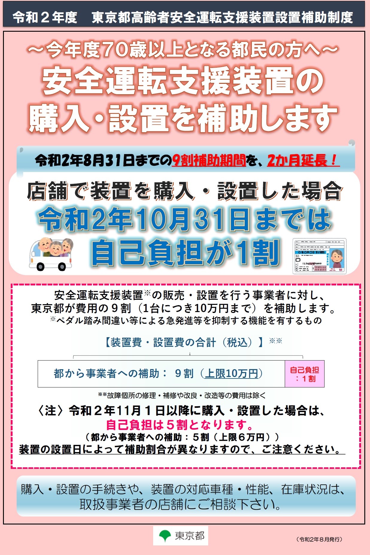 都内在住の高齢運転者が、令和2年8月31日10月31日までの間に、ペダル踏み間違い等による急発信等を抑制する機能を有する安全運転支援装置を購入・設置した場合の自己負担が1割となるよう、取扱い事業者に対し、都が費用の9割を補助します(補助限度額は10万円/台)。