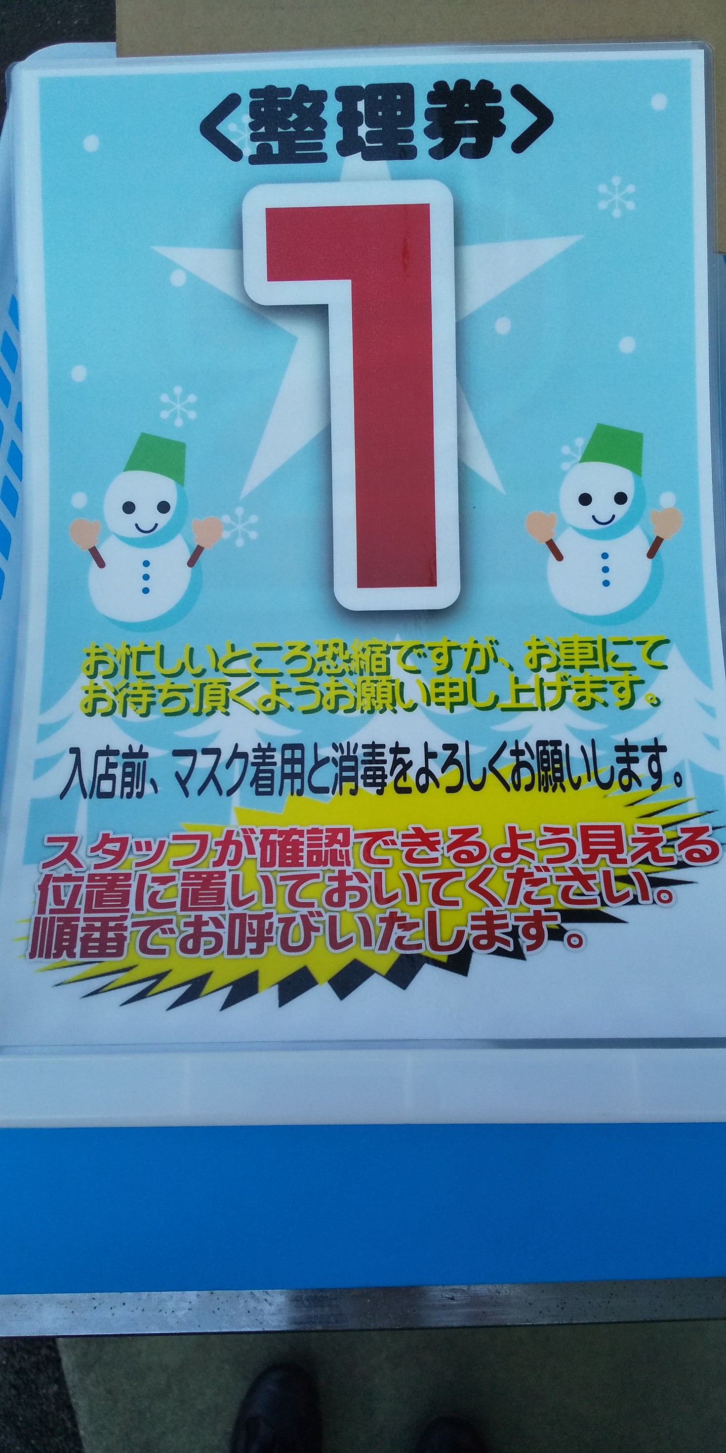 とりあえず、混雑が予想される週末や祝日は、朝などの密集しやすい時間帯のみ整理券を取っていただき、ダッシュボートに置いてお車で待機していただく方法を取るように考えております。