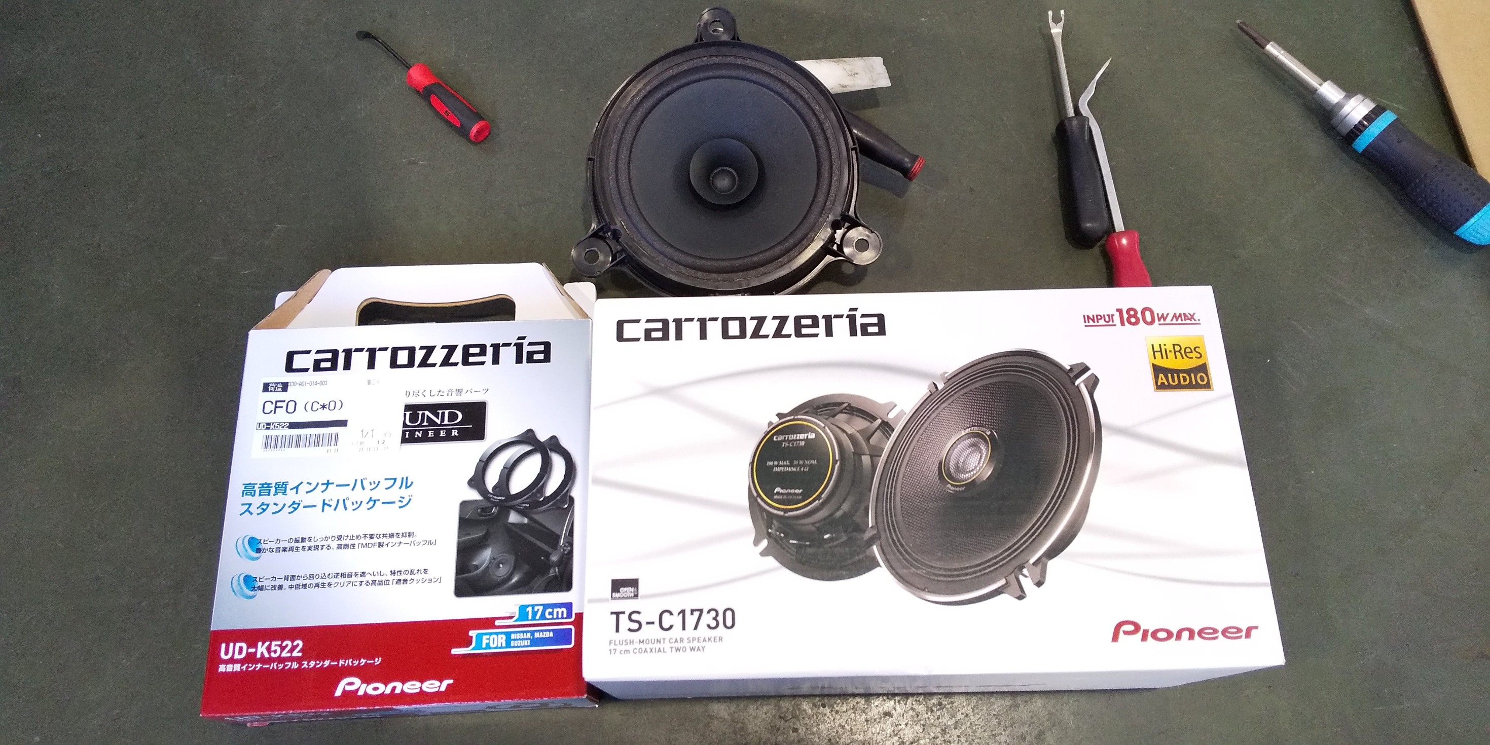 今回はオーディオの音質が悪いのでなんとかならないかとのご相談だったので、とりあえず手始めに純正の軽い紙コーンで貧弱なスピーカーをカロッツェリアに交換してみました☆