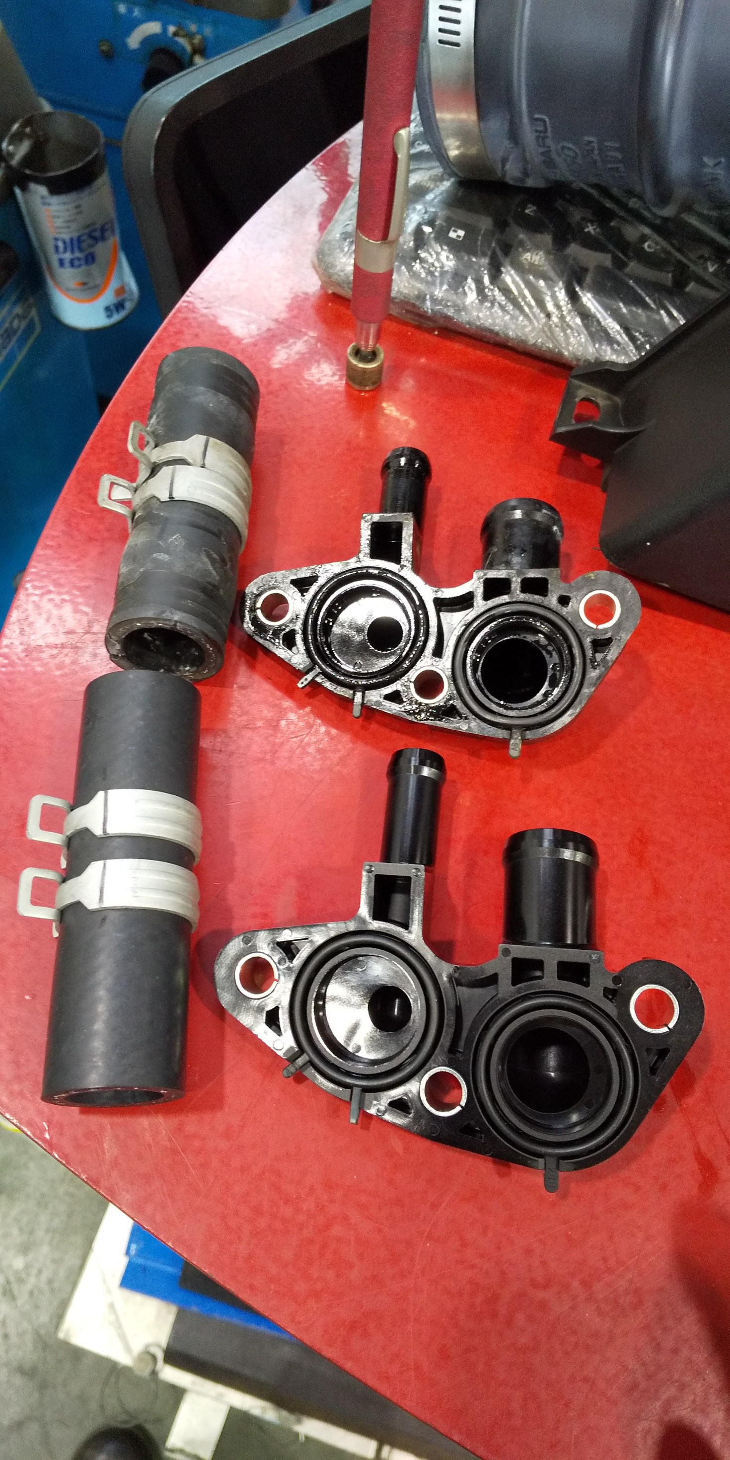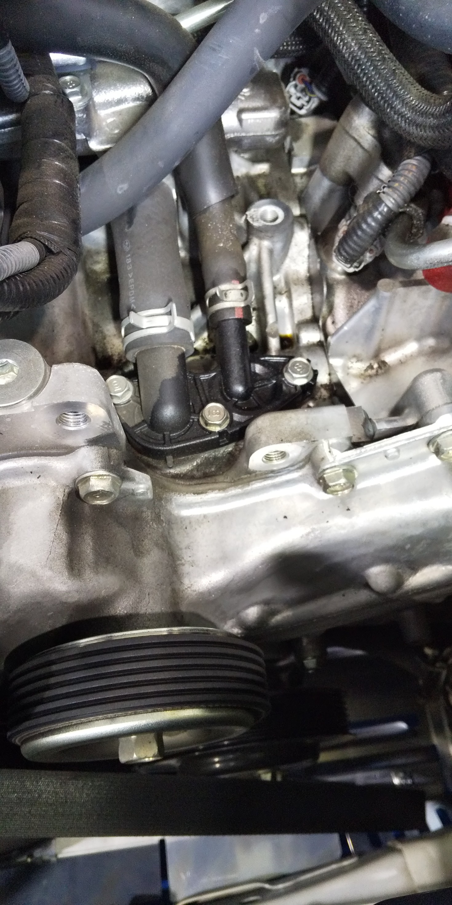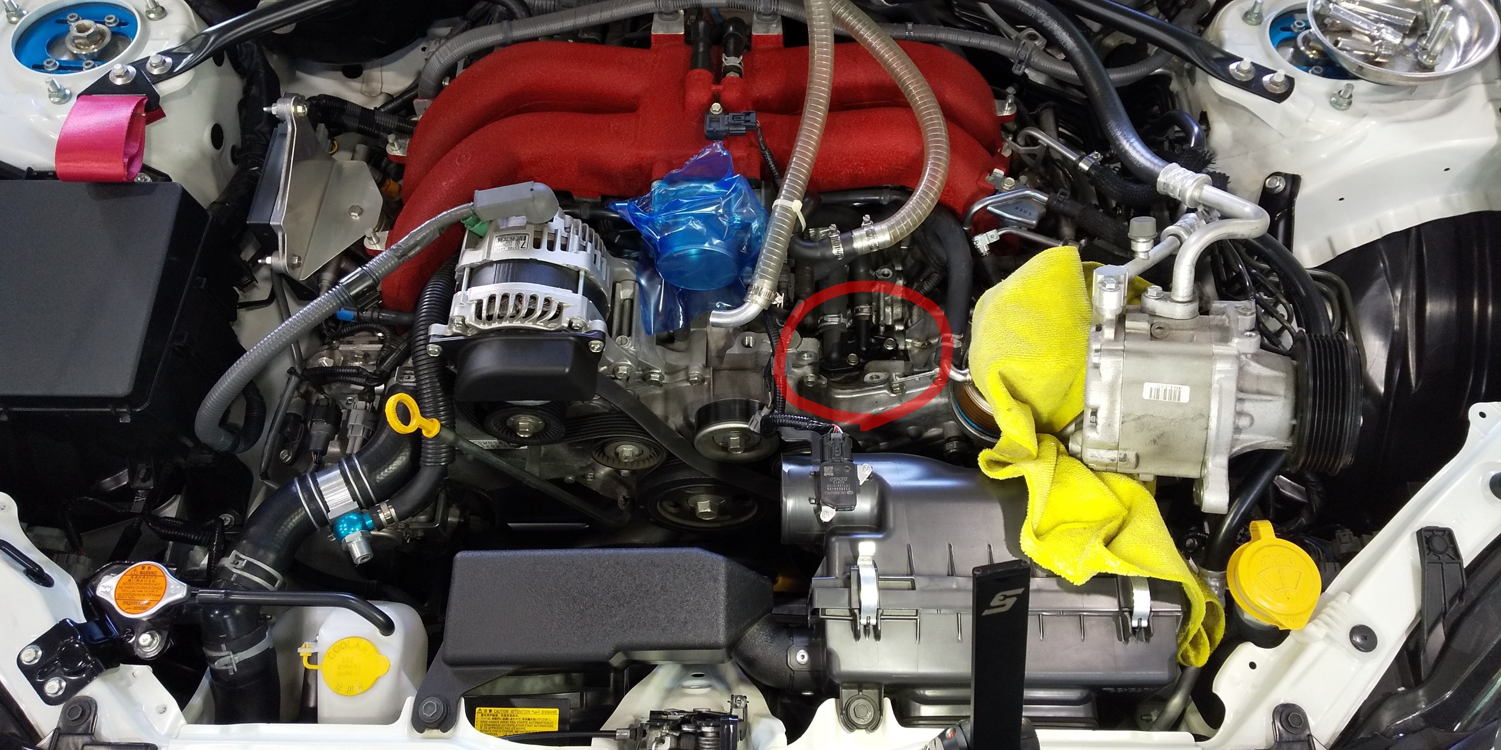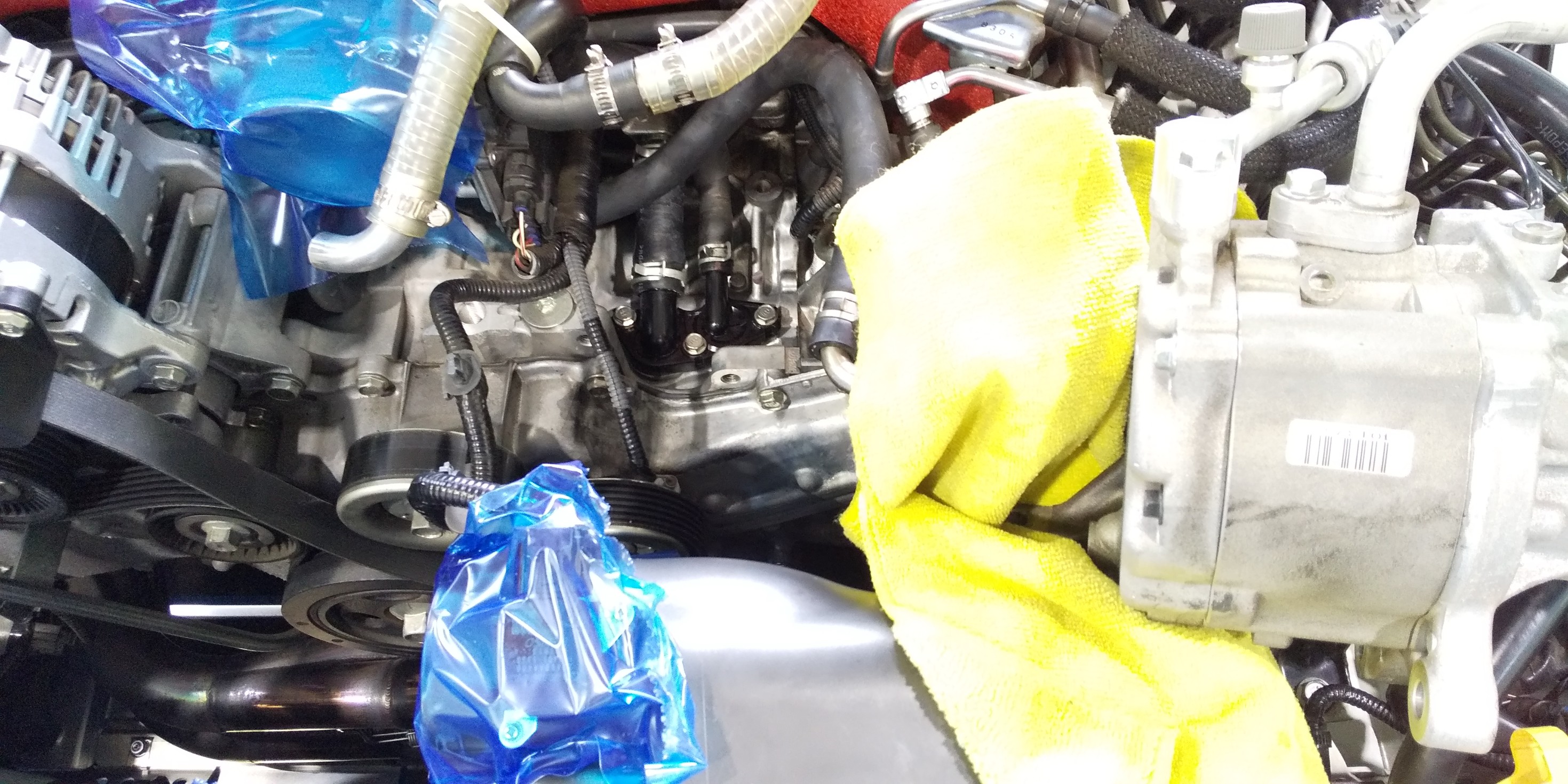 2本でてるホースの片方はクーラント回してるウォーターホースなので、エンジン内に水回さないように万全を期して慎重に外していきます。。。