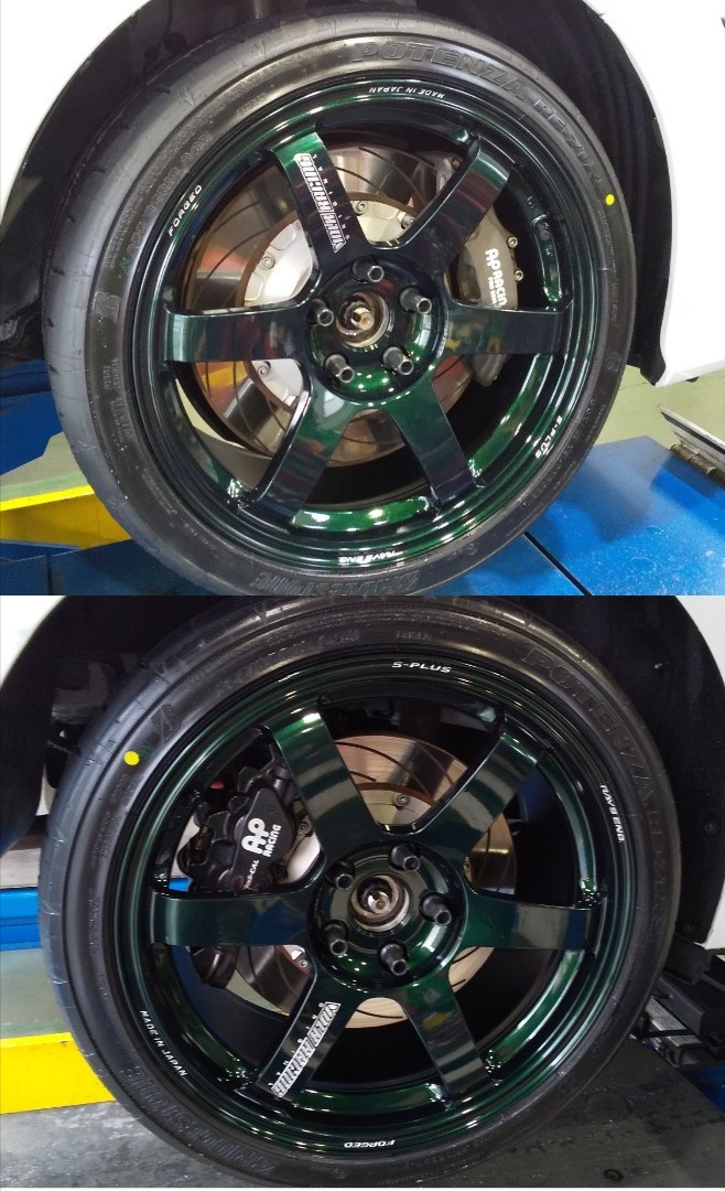 アルミはレイズのTE37の特注カラーのRacingグリーン、タイヤはポテンザのRE71RS、、、