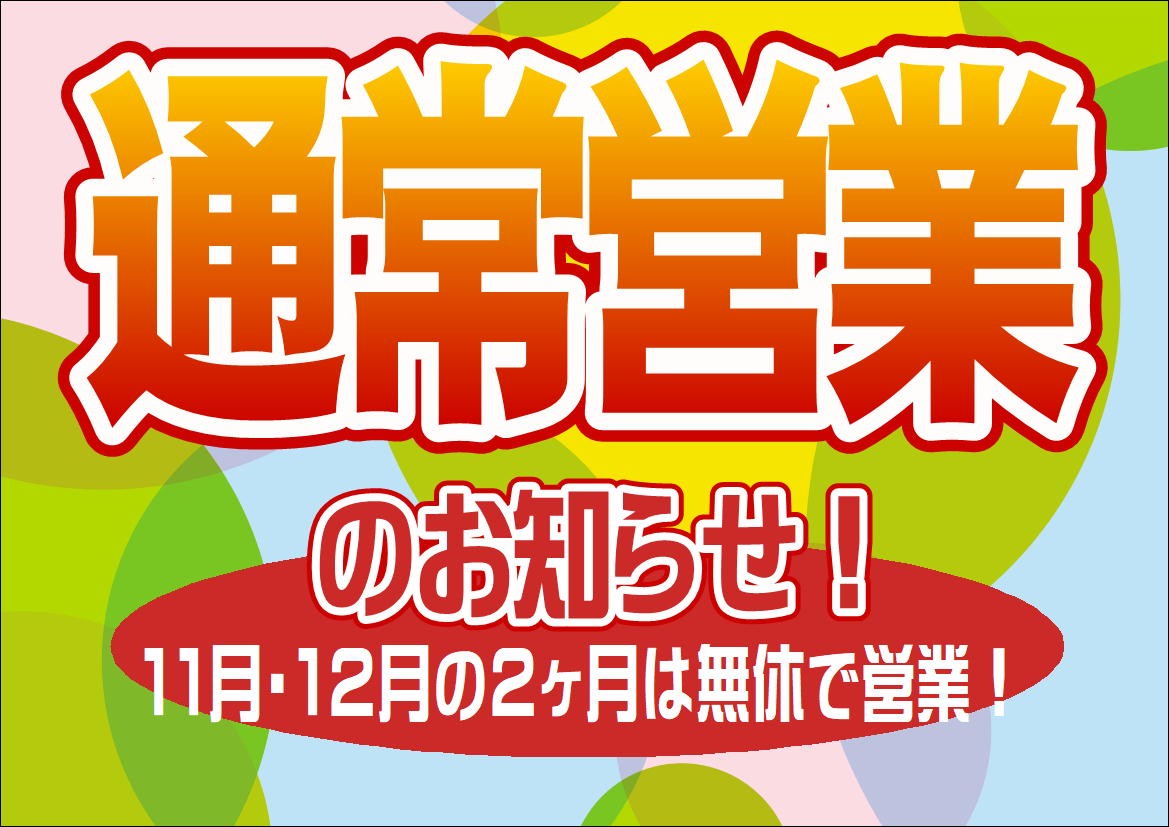 11月からの営業日について! ポスト 2023年10月23日 日頃より当店をご利用いただきましてありがとうございます。 2023年11月・12月のご案内いたします。 5月~10月の毎週火曜日を定休日とさせて頂きましたが、 11月1日から12月30日まで無休で営業させて頂きます。 2023年最後までよろしくお願いいたします。 詳しくはホームページでご確認ください。 お客様には、何卒ご理解くださいますようお願いいたします。 カテゴリ:お知らせ